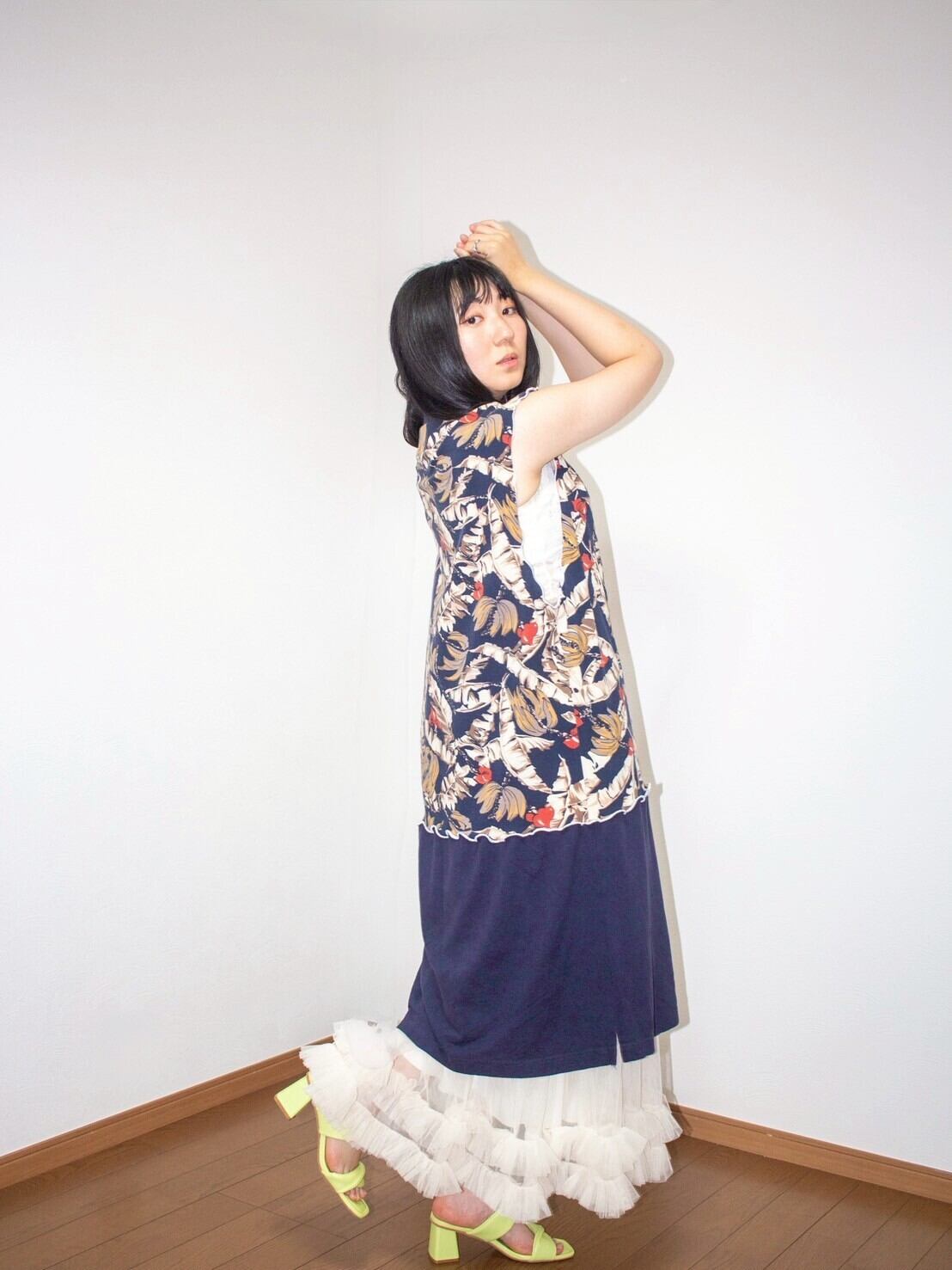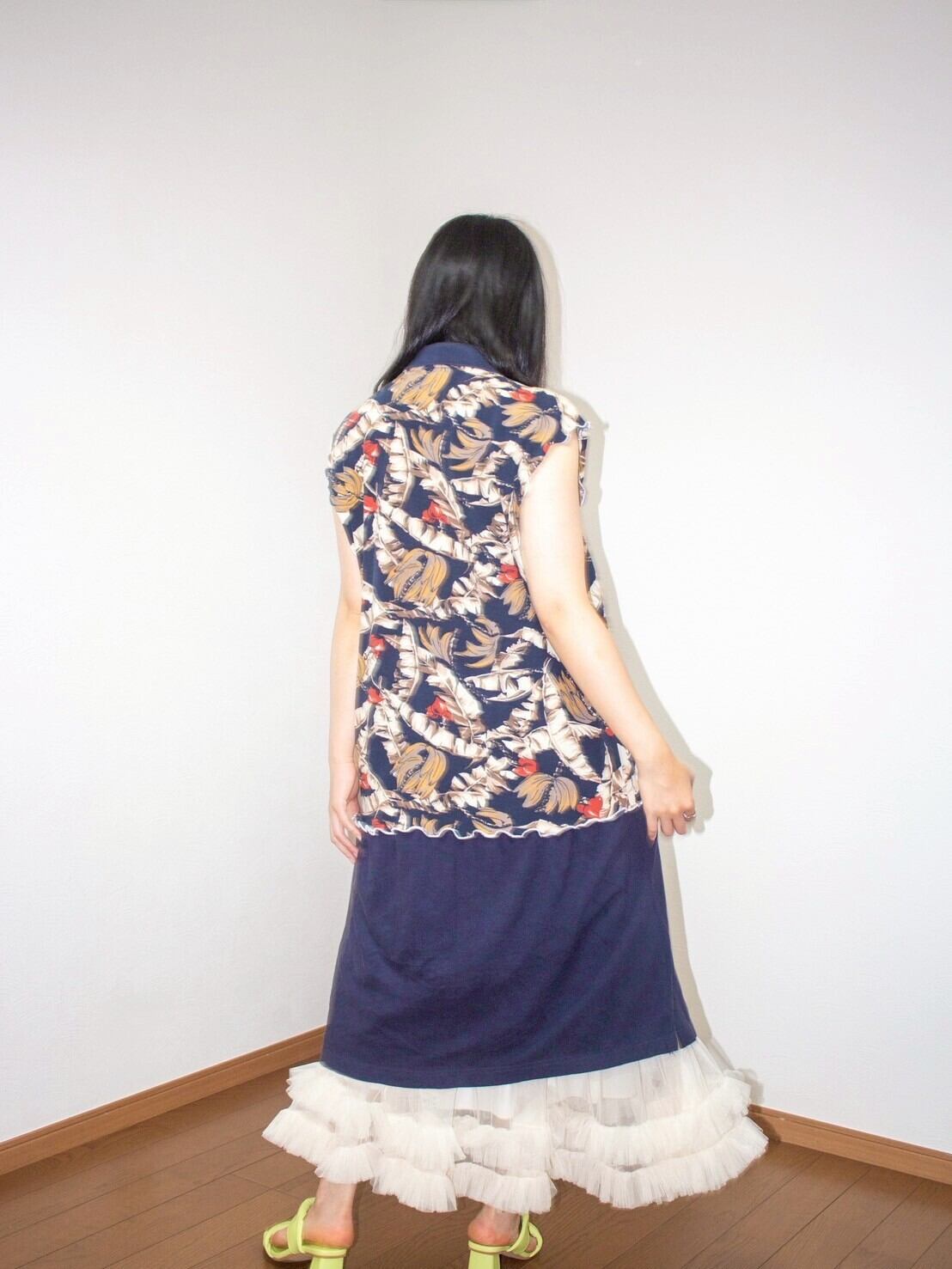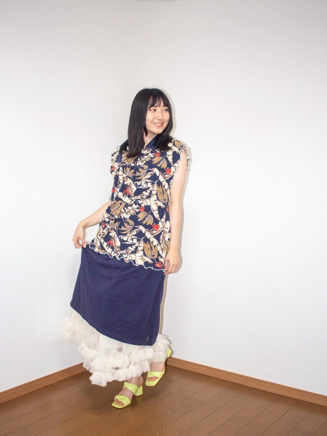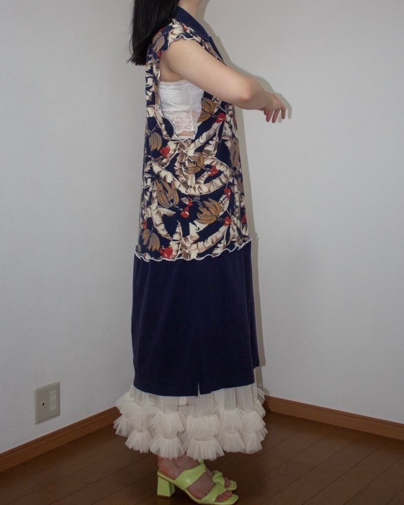 袖ぐりが大きく空いてるので、レースのブラトップなどを合わせて、密かなレイヤーを楽しんで。