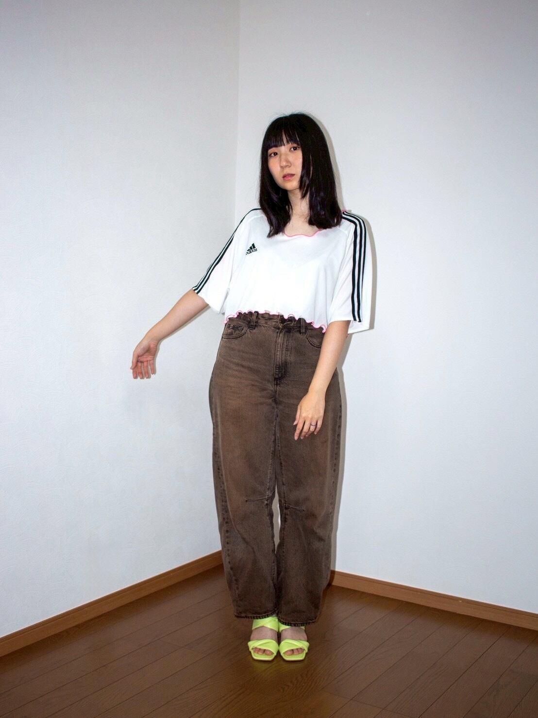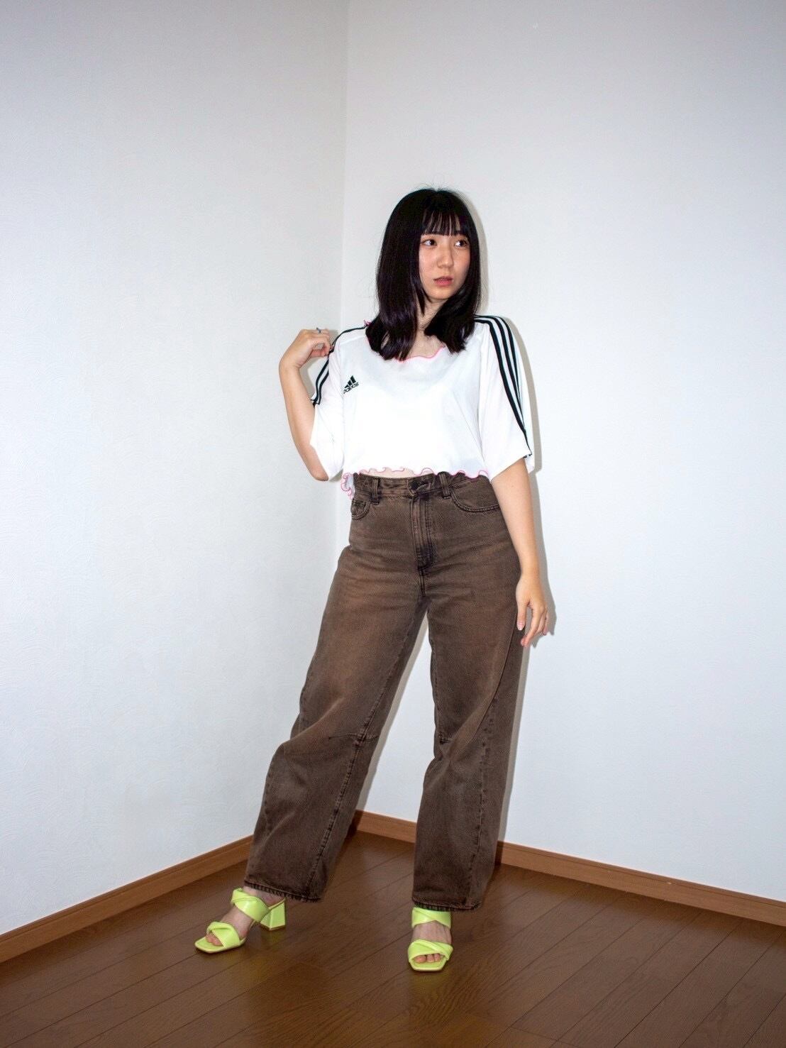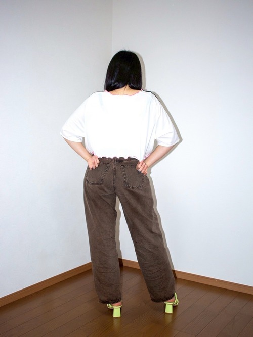 柔らかな素材感と短めの丈が、ボトムスとのバランスを取りつつ、トレンド感を演出。