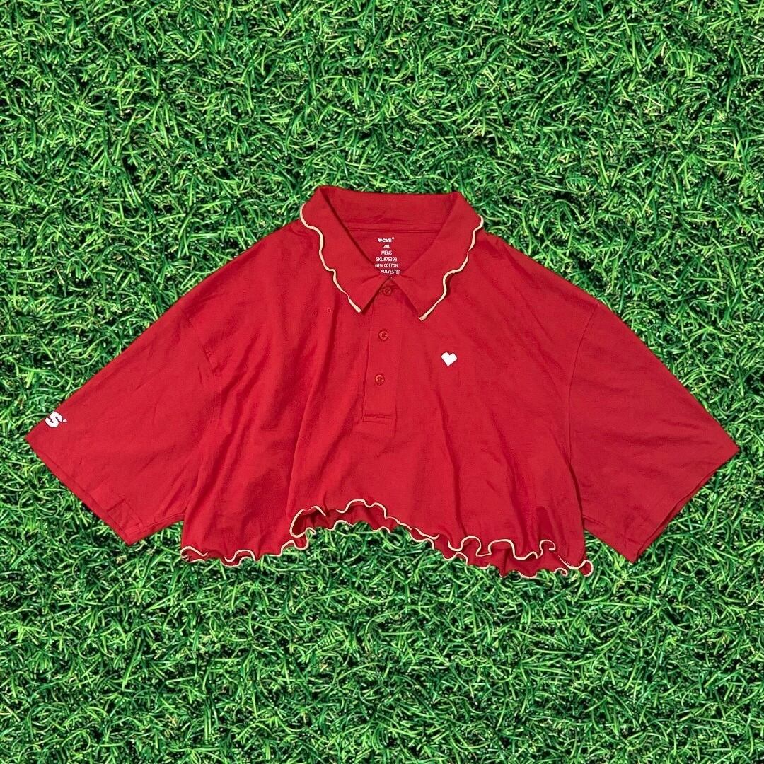 ポップなレッドとイエローが可愛いチビ丈ポロシャツ。