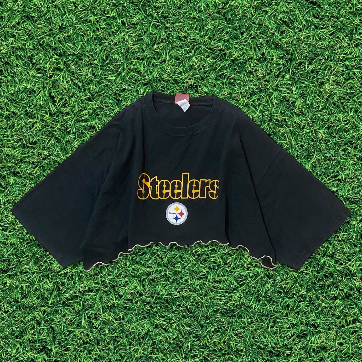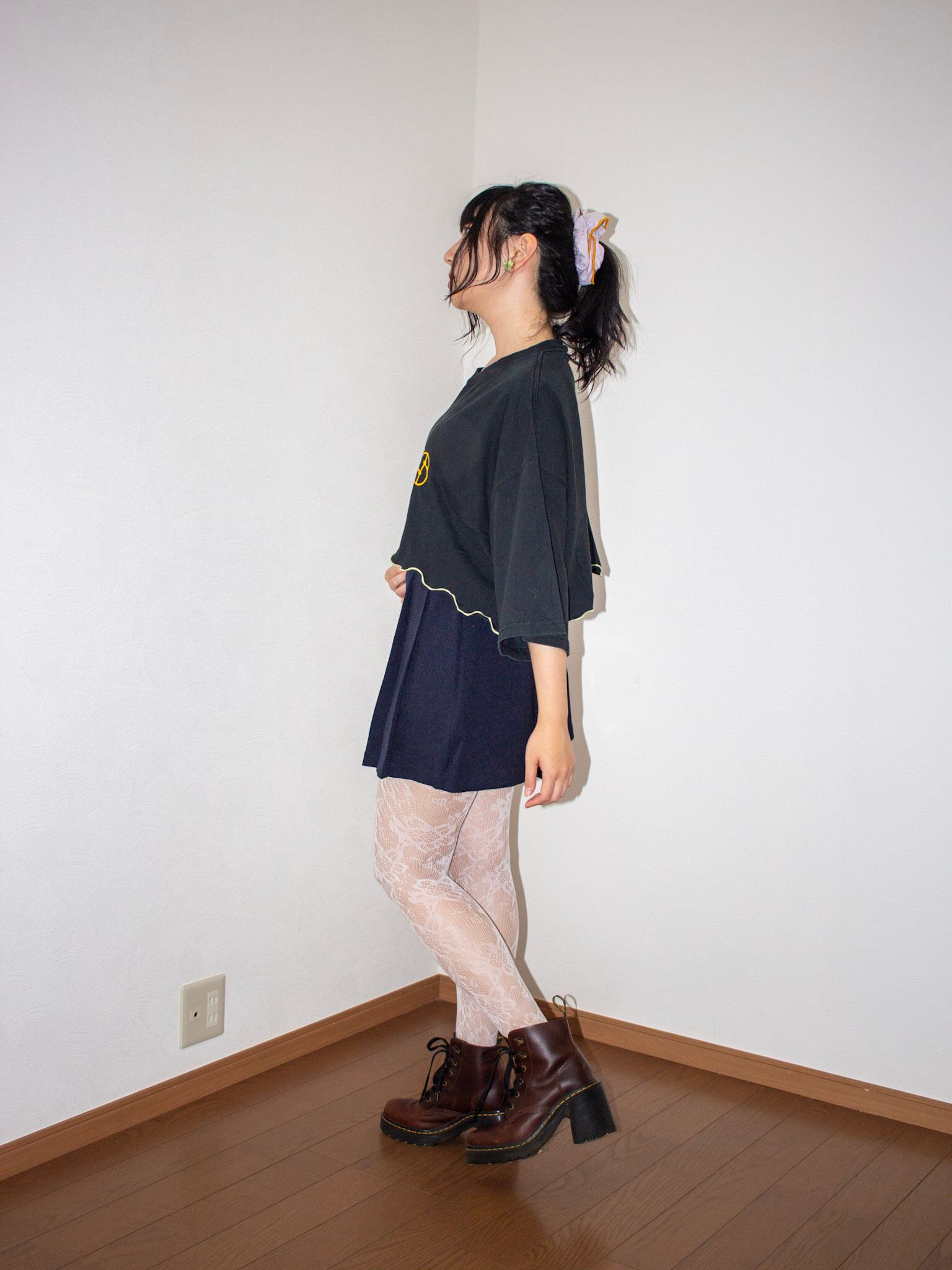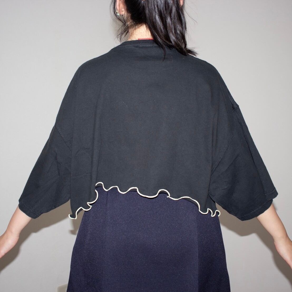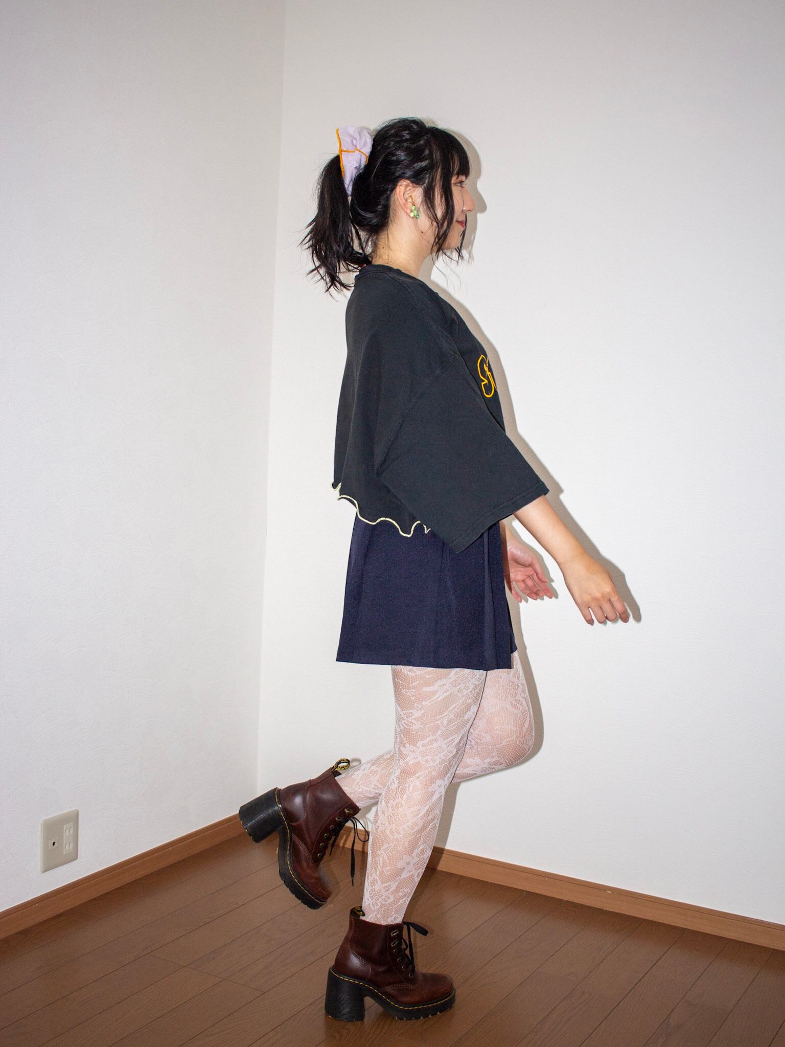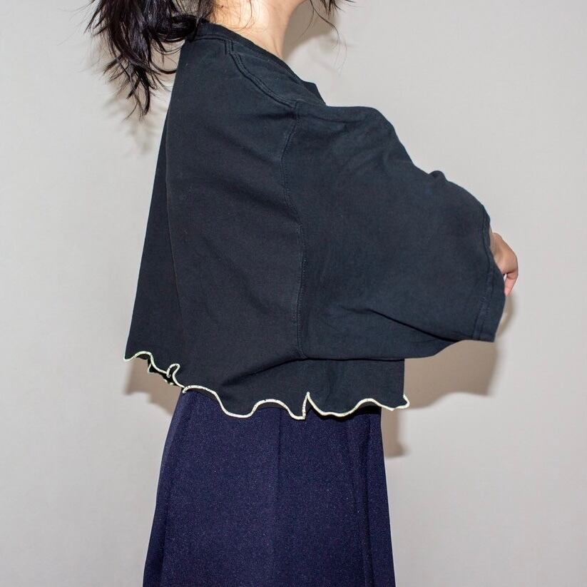 もともとビッグシルエットのアイテムだったため、チビ丈なのに太めの袖や横幅がさらにユニークなシルエットを演出。