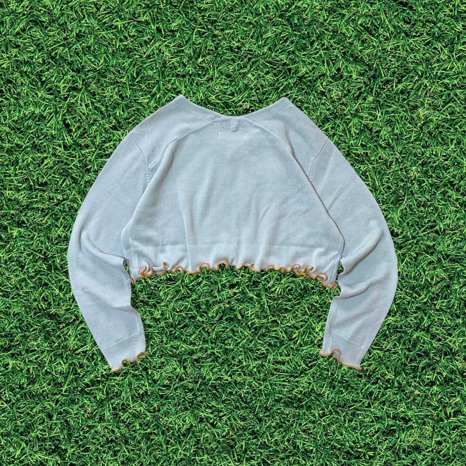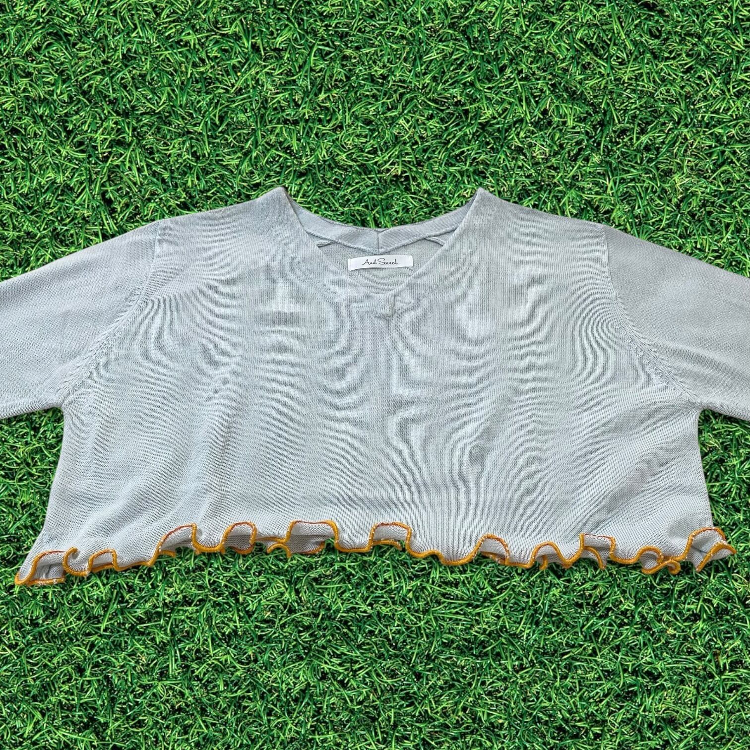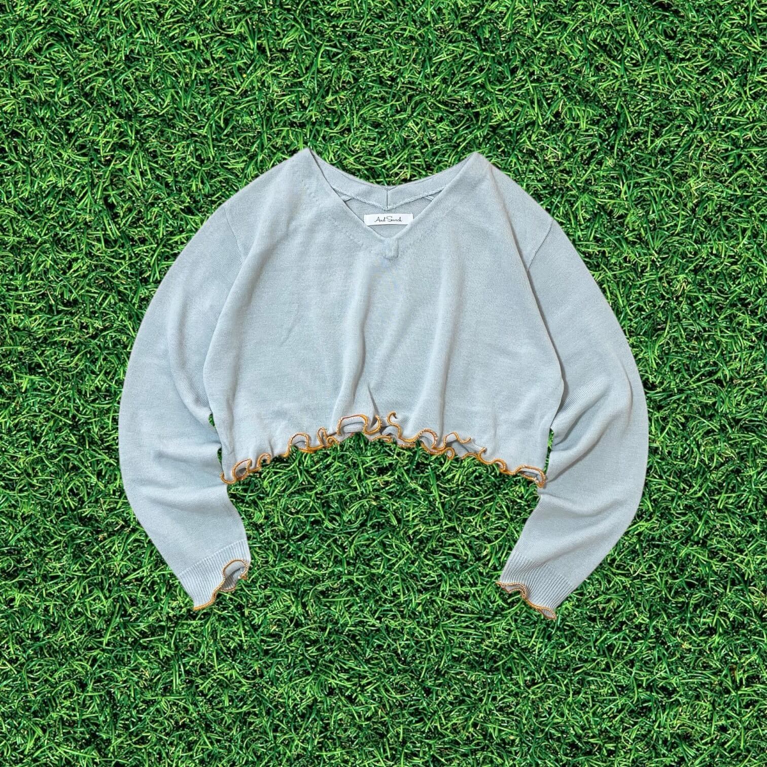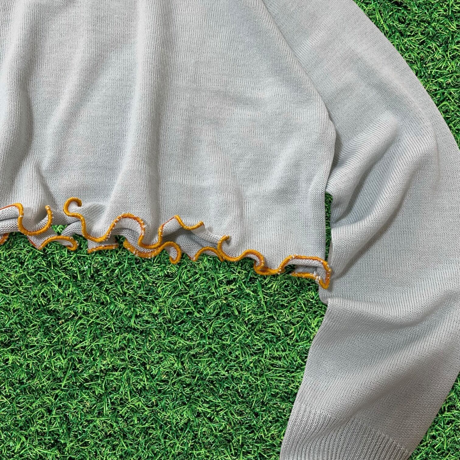 パステルグリーンにオレンジ色のメローが目を惹くチビ丈ニット。