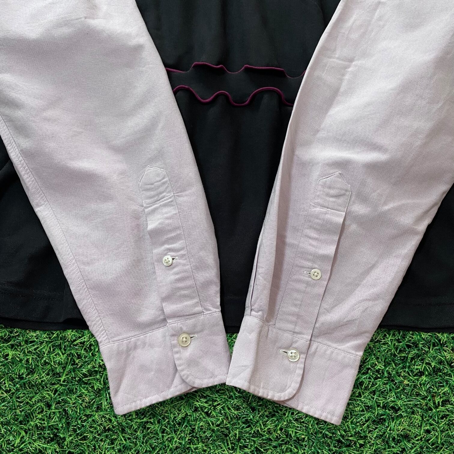 企業ロゴ入りポロシャツとパープルシャツの再構築リメイクシャツ。