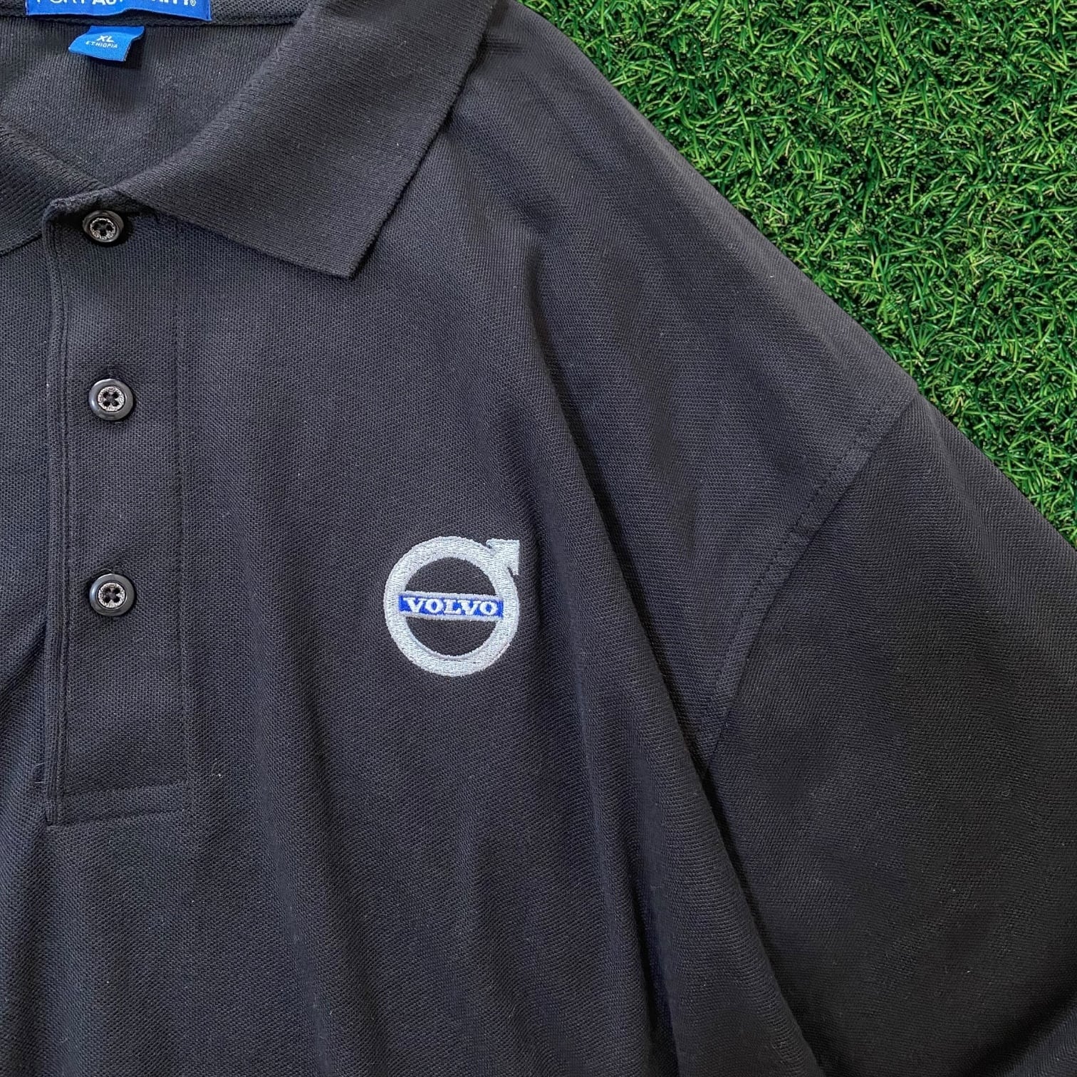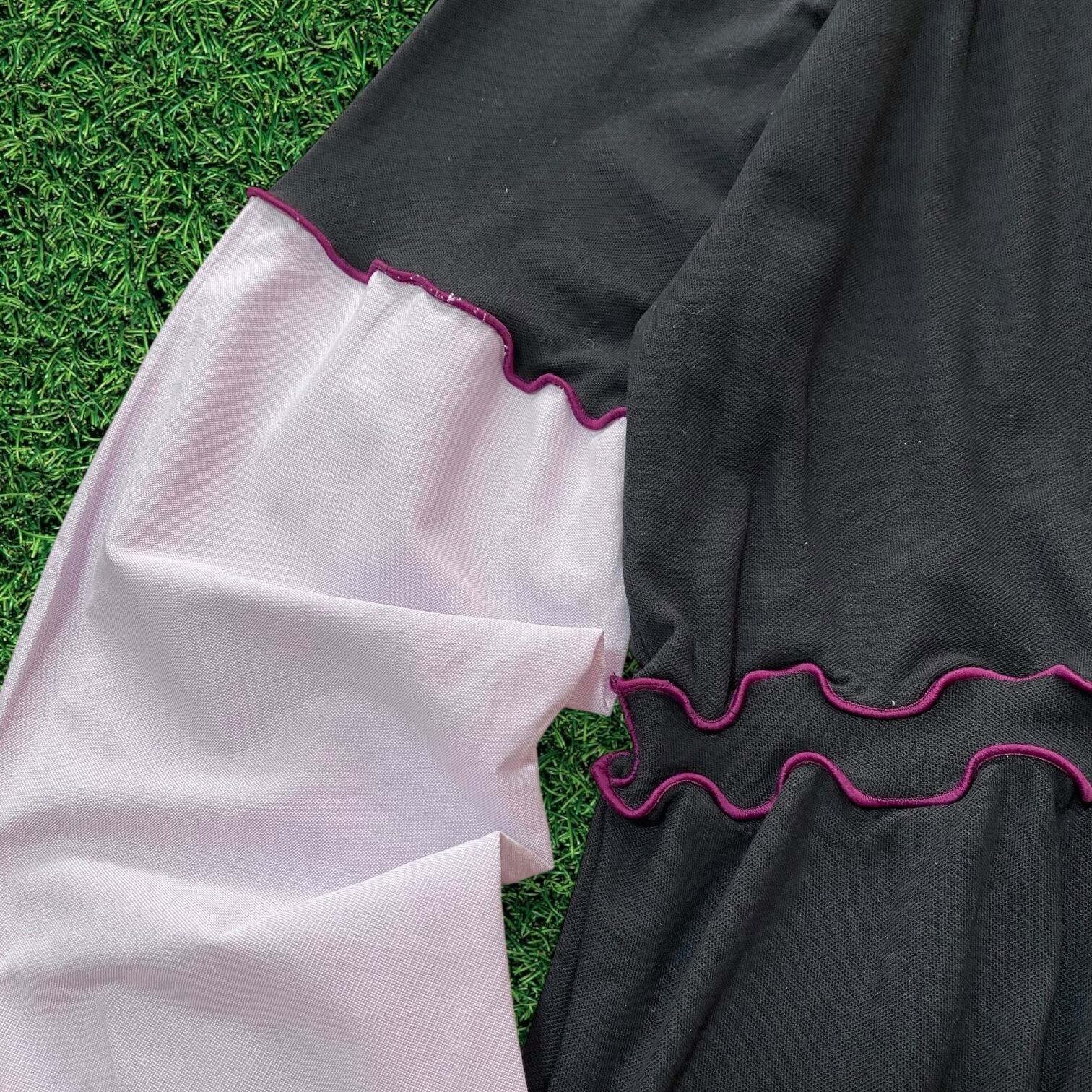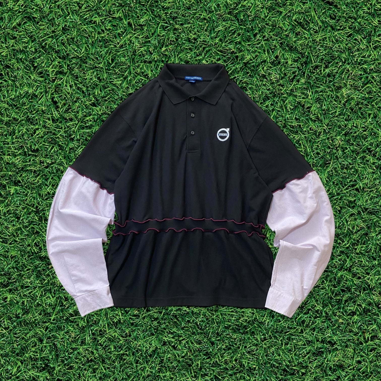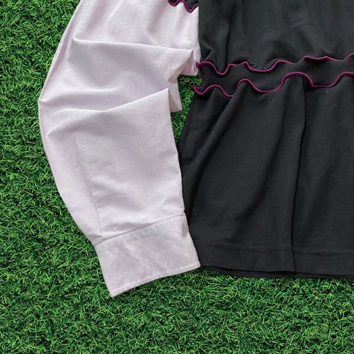 【リメイク古着】再構築mellowフリル個性派企業ロゴ入りポロシャツ ブラック×パープル