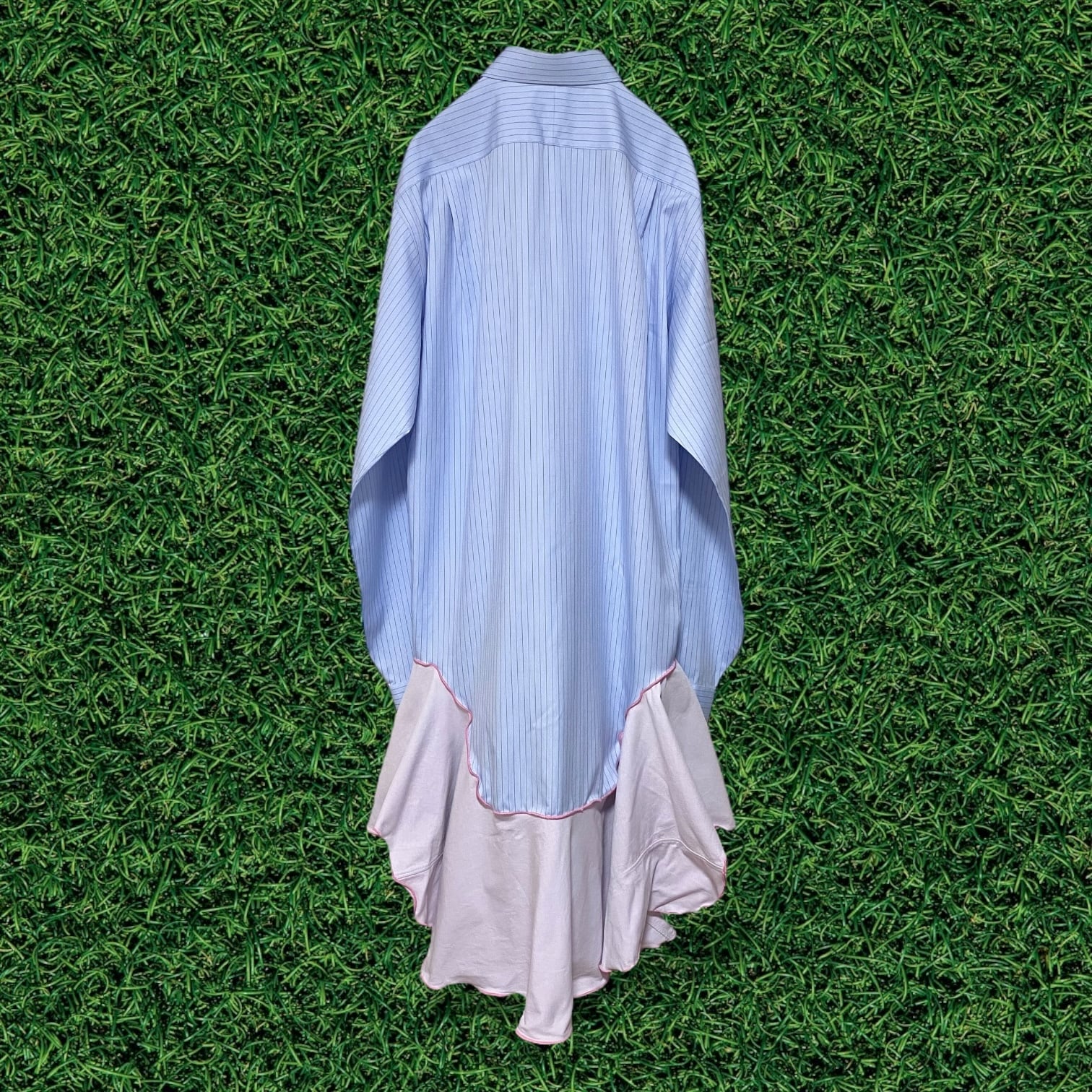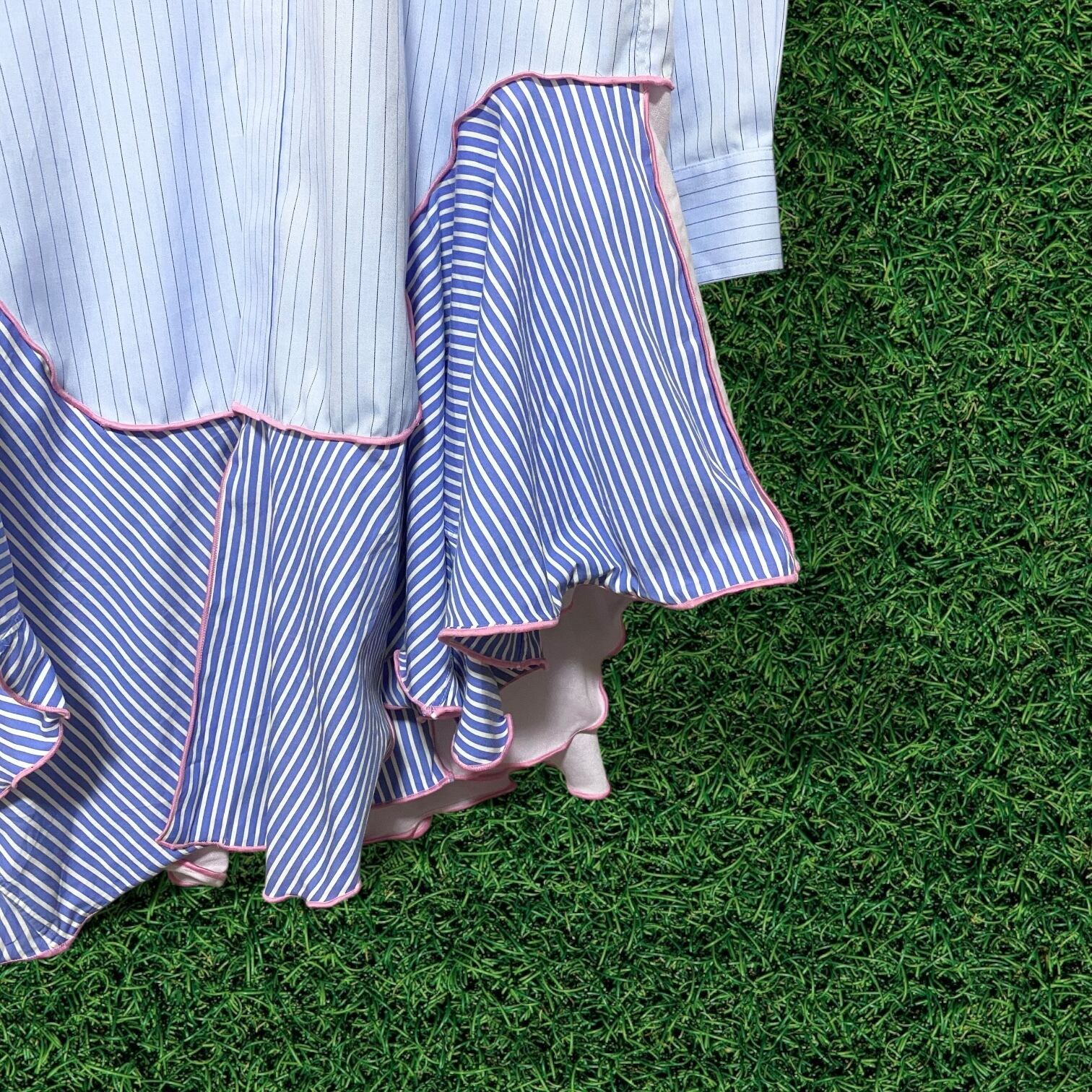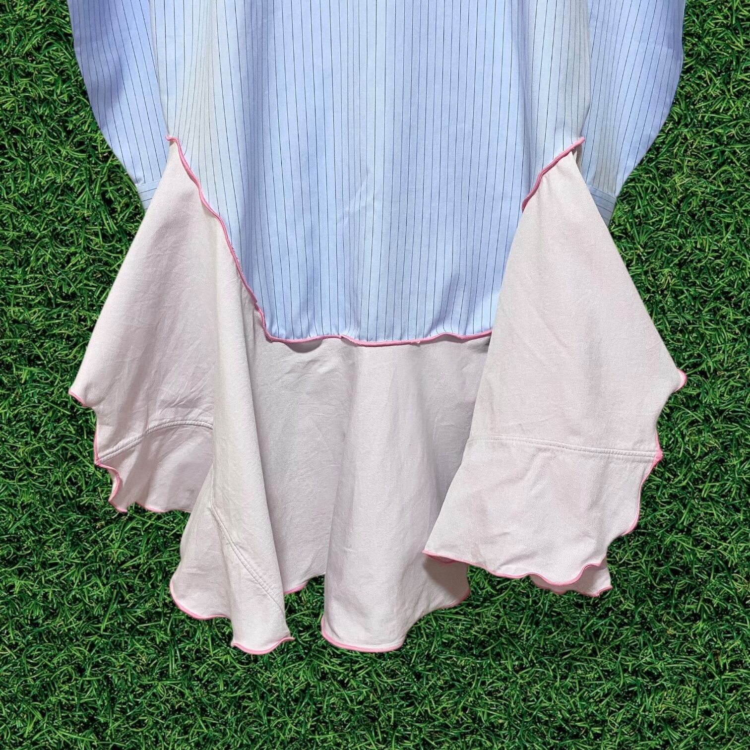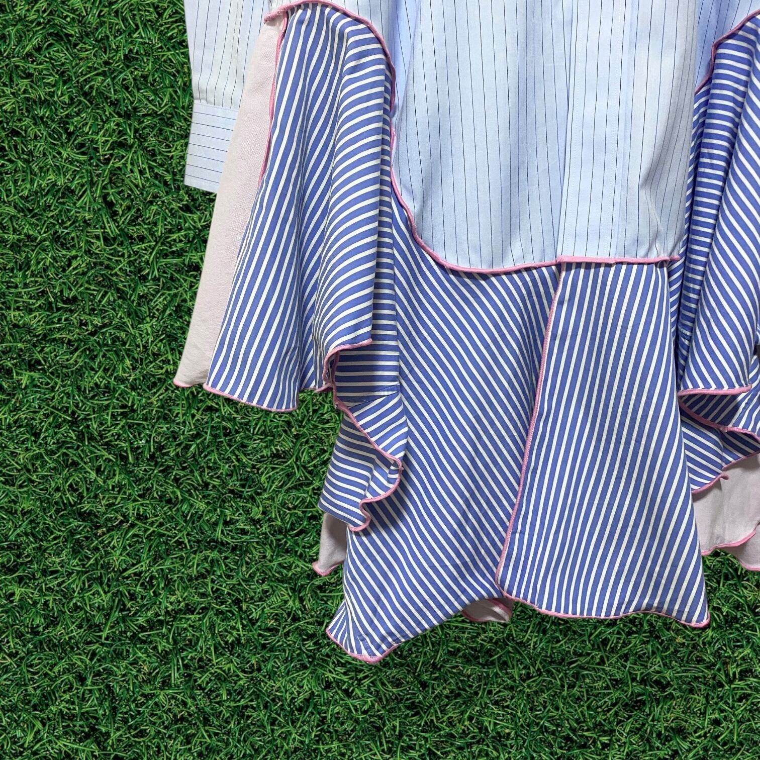 【リメイク古着】再構築メローフリル個性派ワンピースシャツ ストライプシャツ×ピンク
