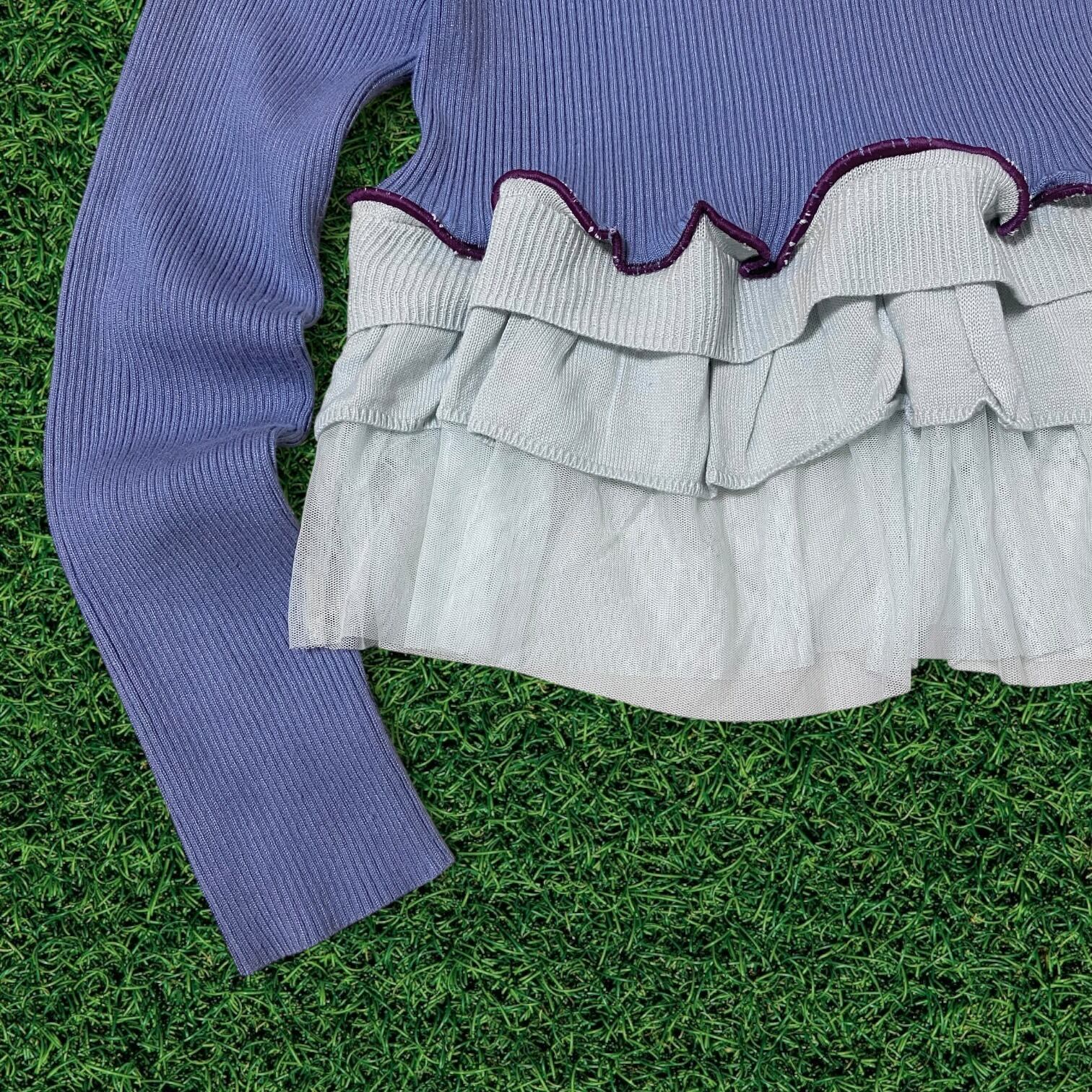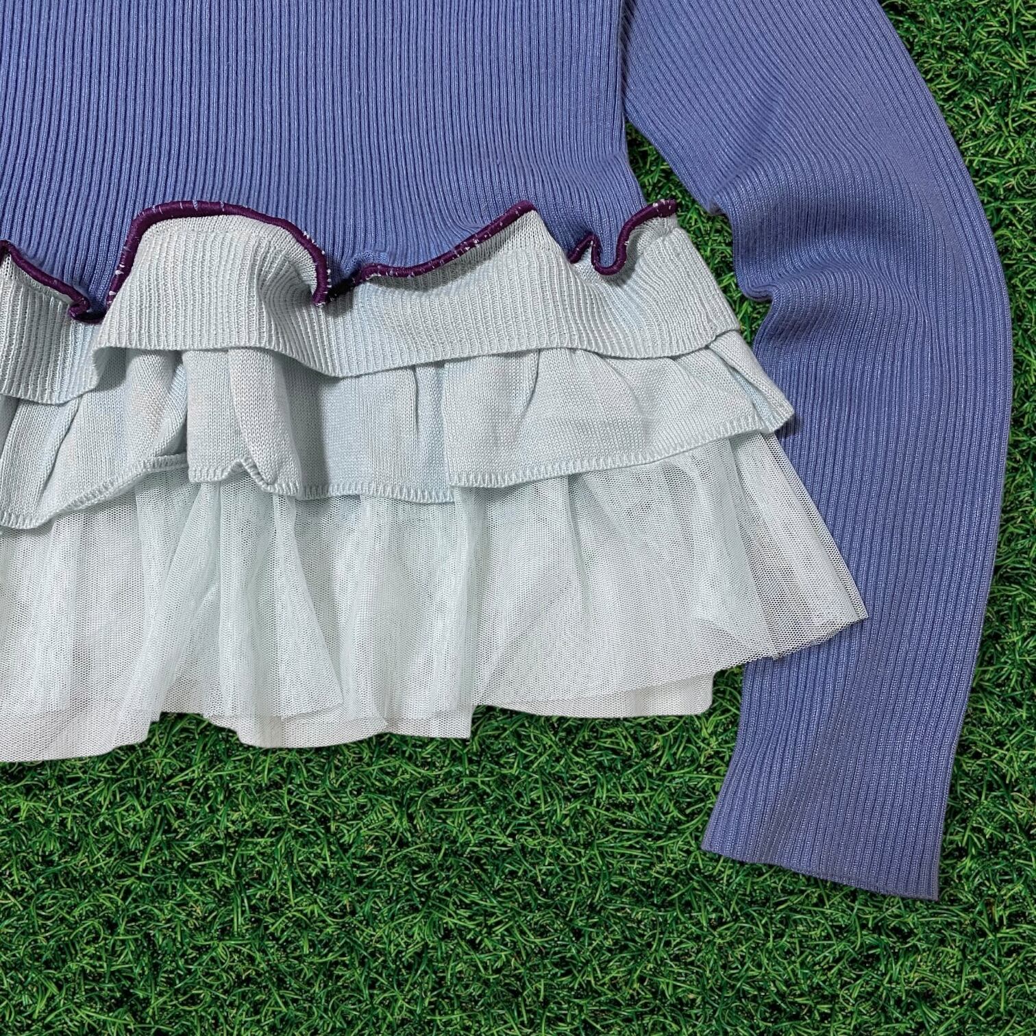 シンプルなブルーのカットソーにミントグリーンのフリルをドッキングした一点。