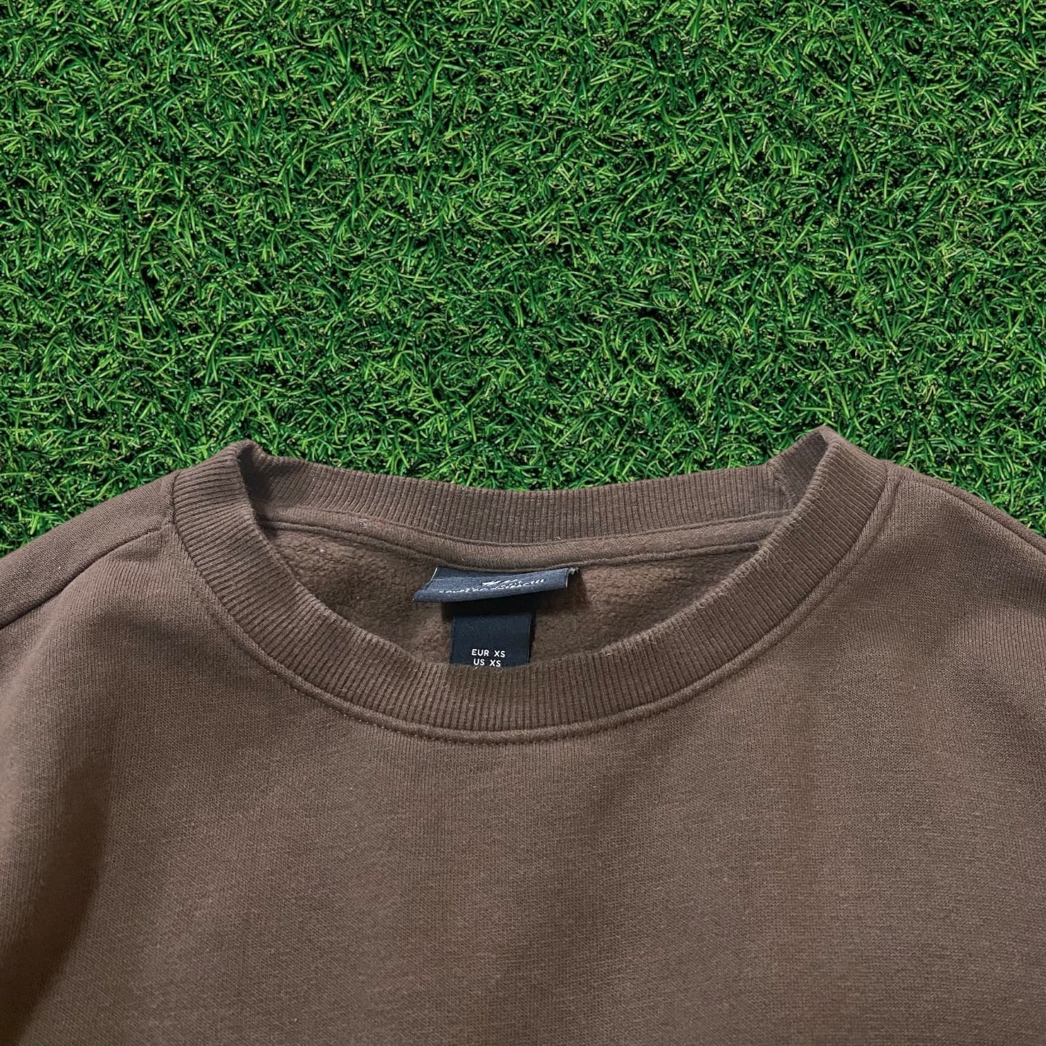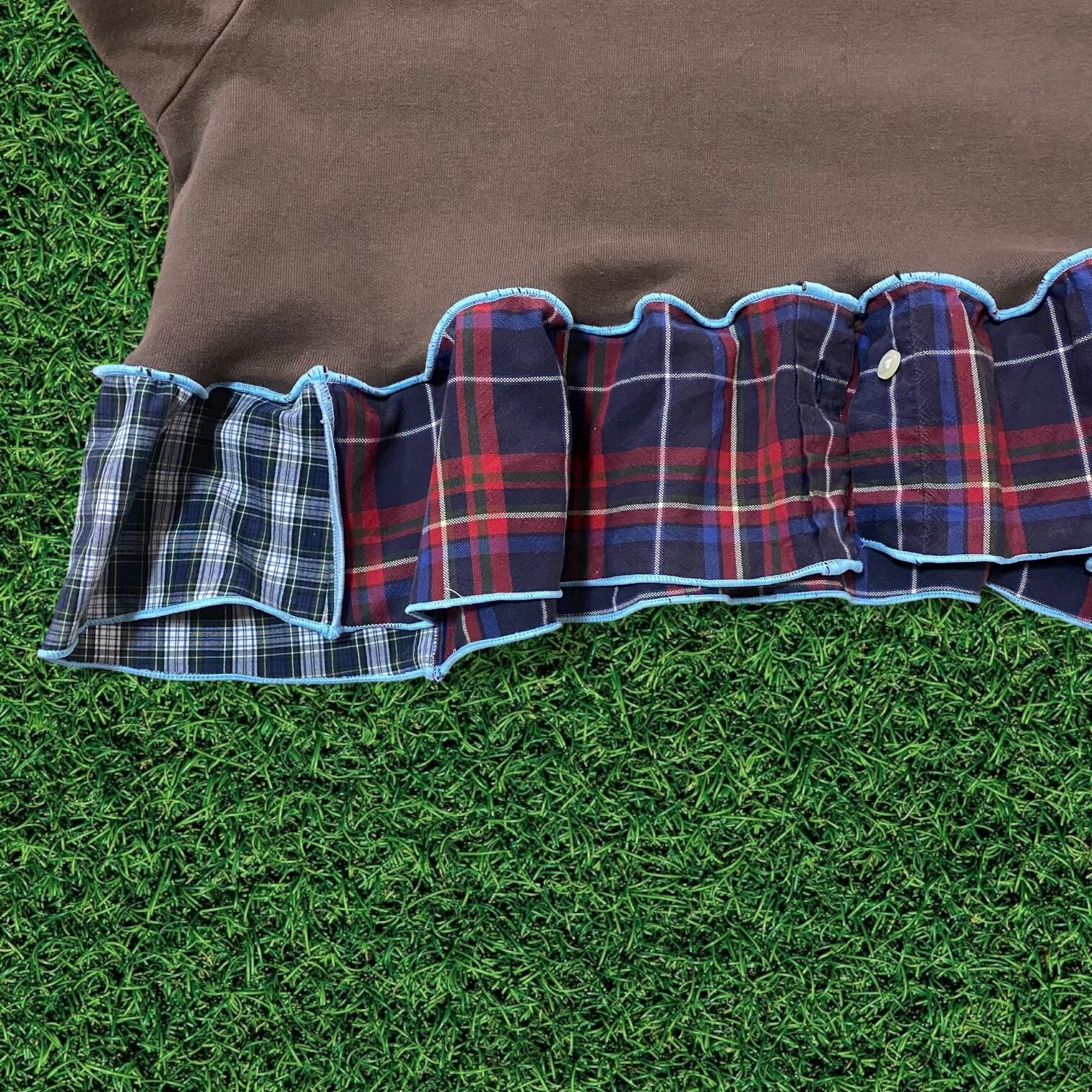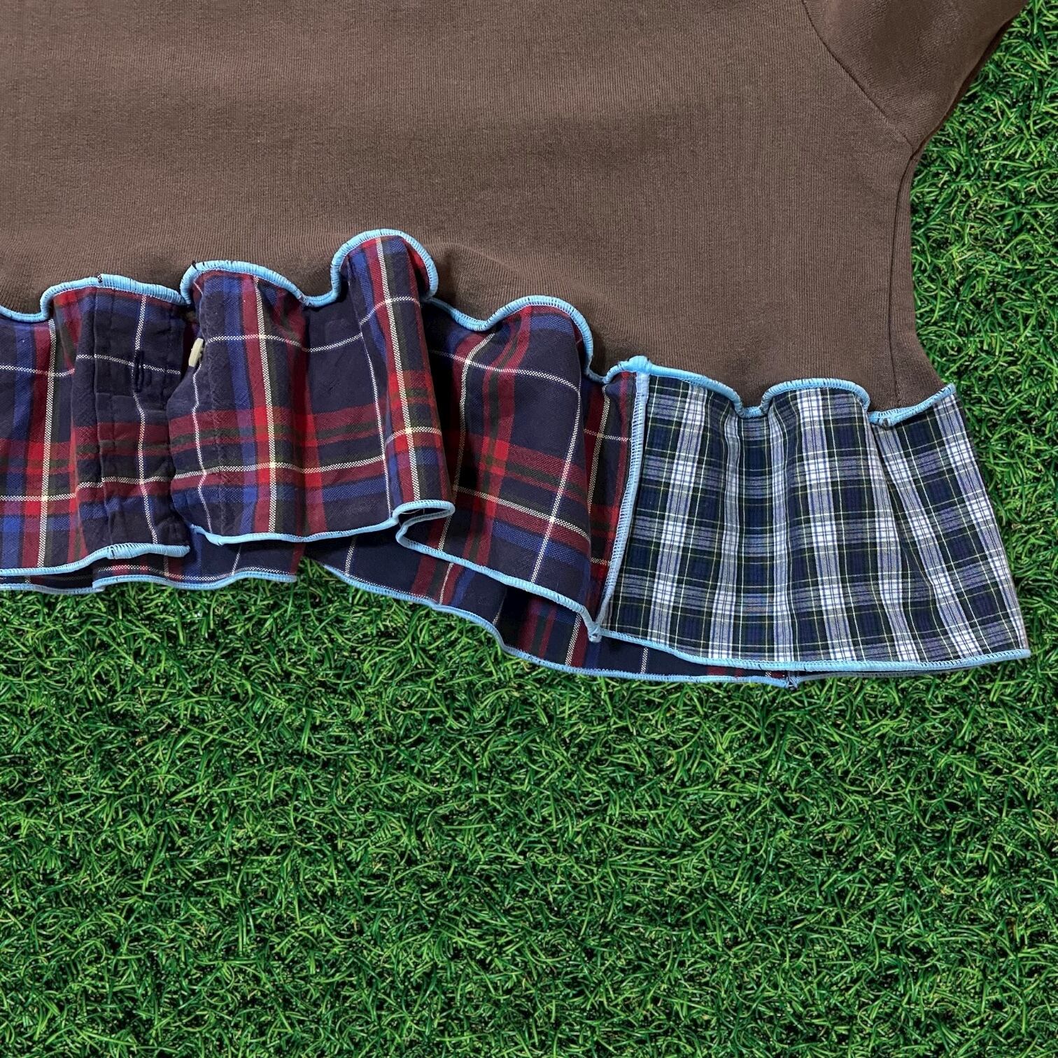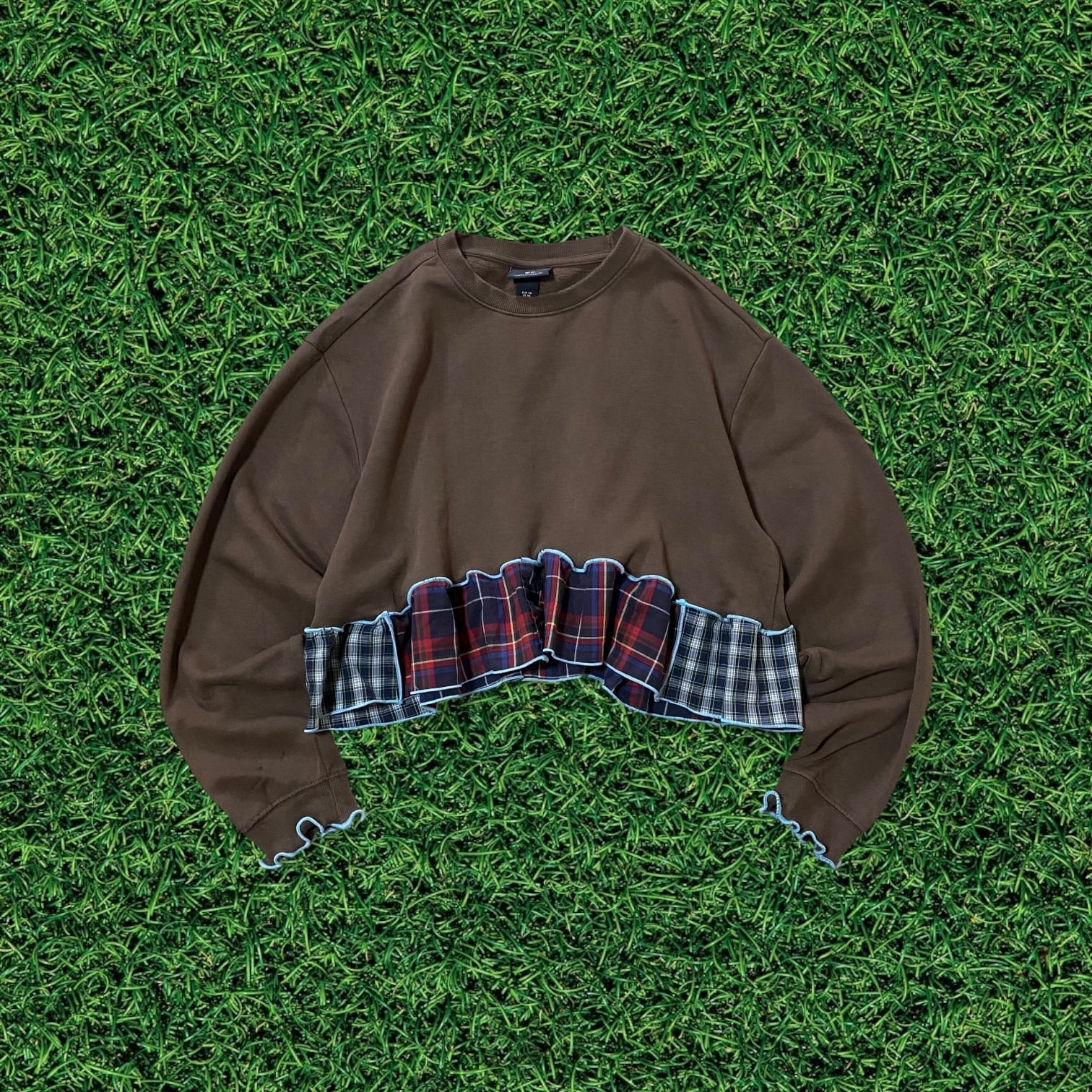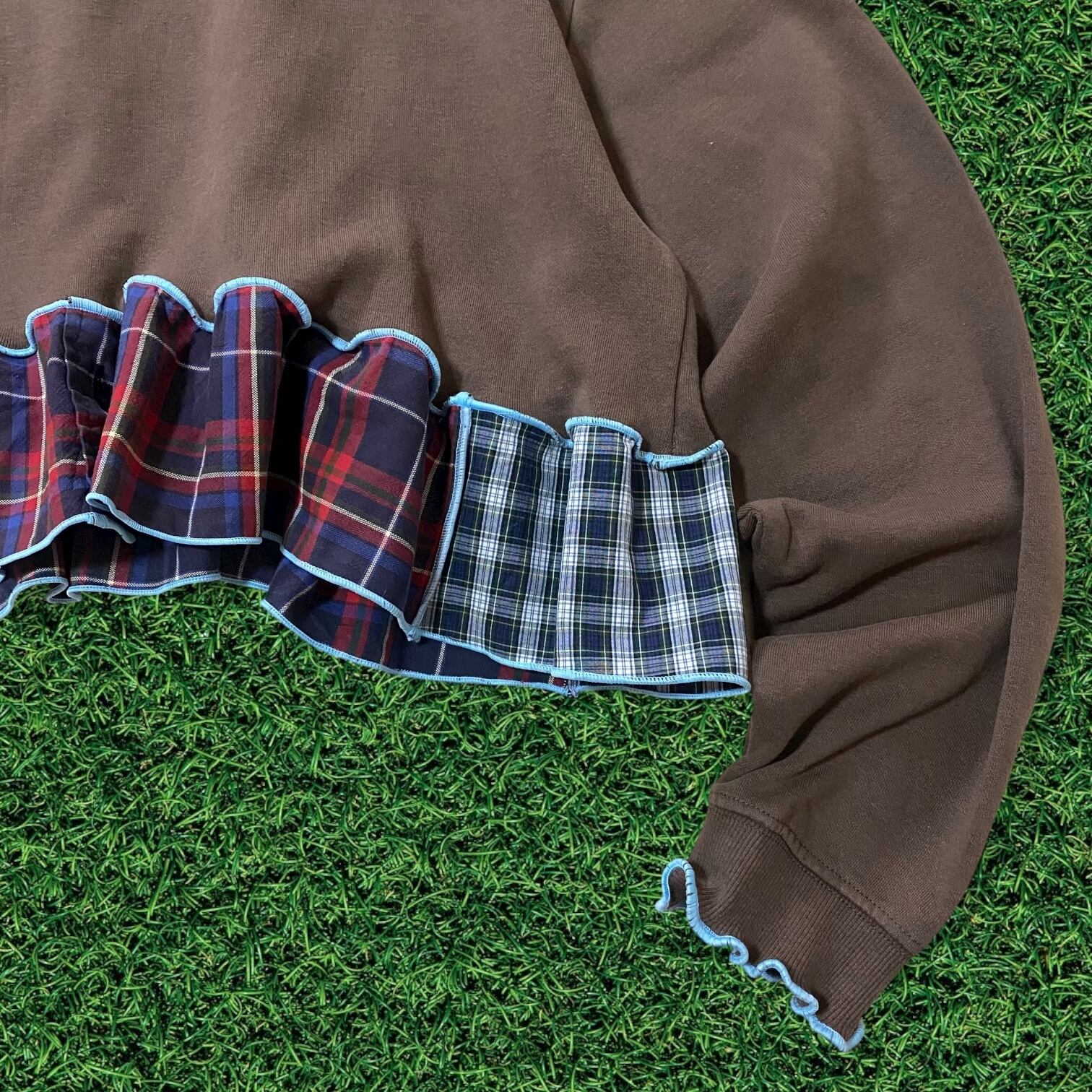 ブラウンのスエットトレーナーにネイビーとレッドのチェックフリルがあしらわれたスエットトレーナー。