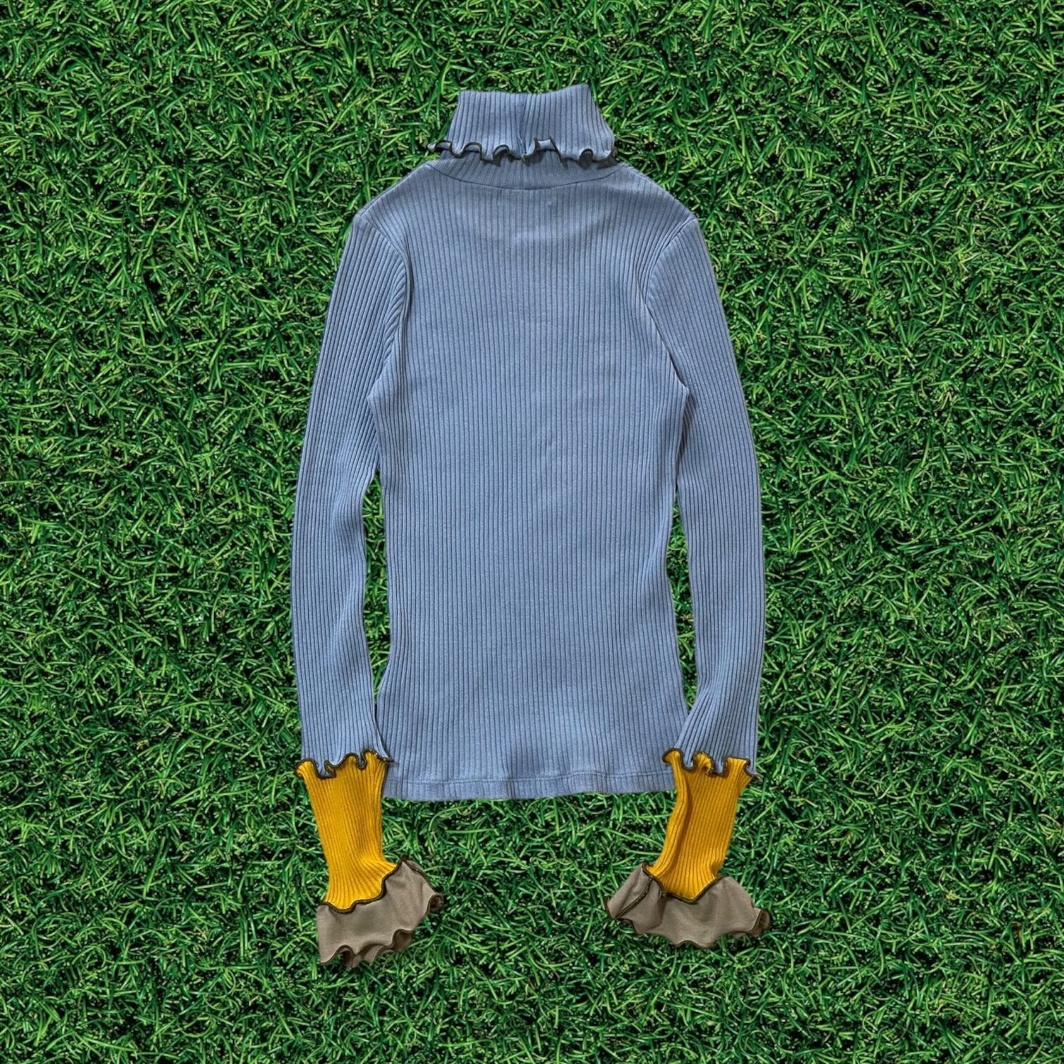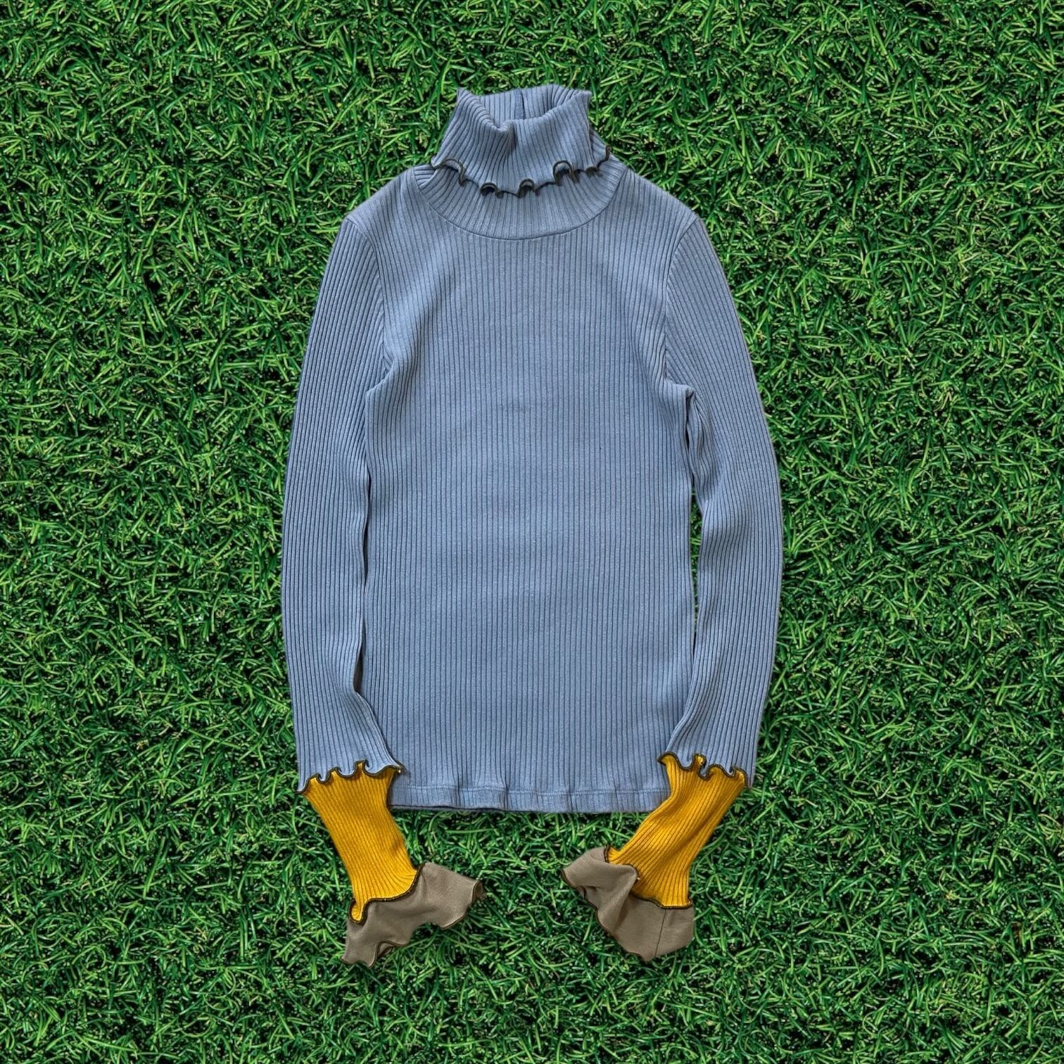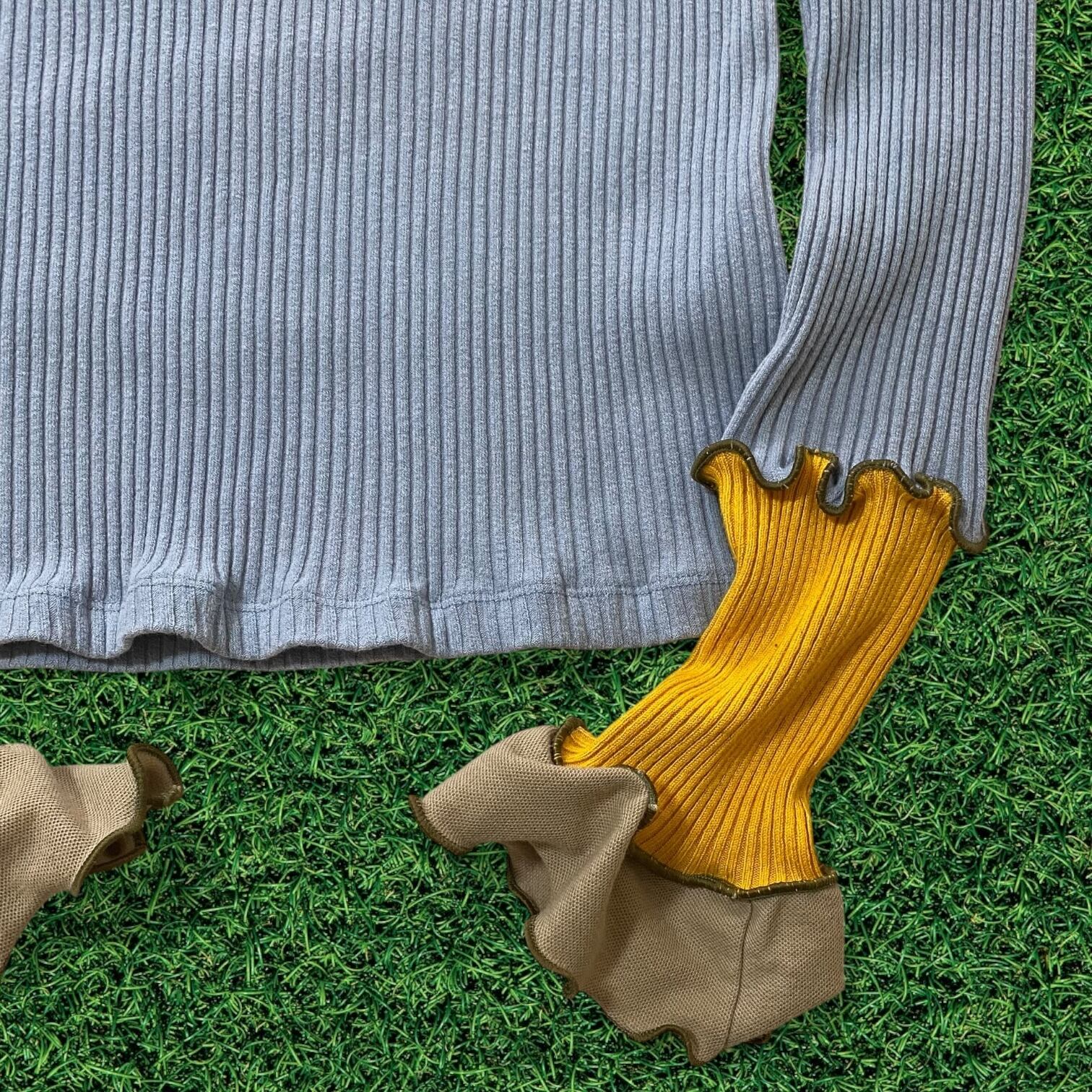 グレーのメローフリルで繋いだパッチワークな袖が特徴。