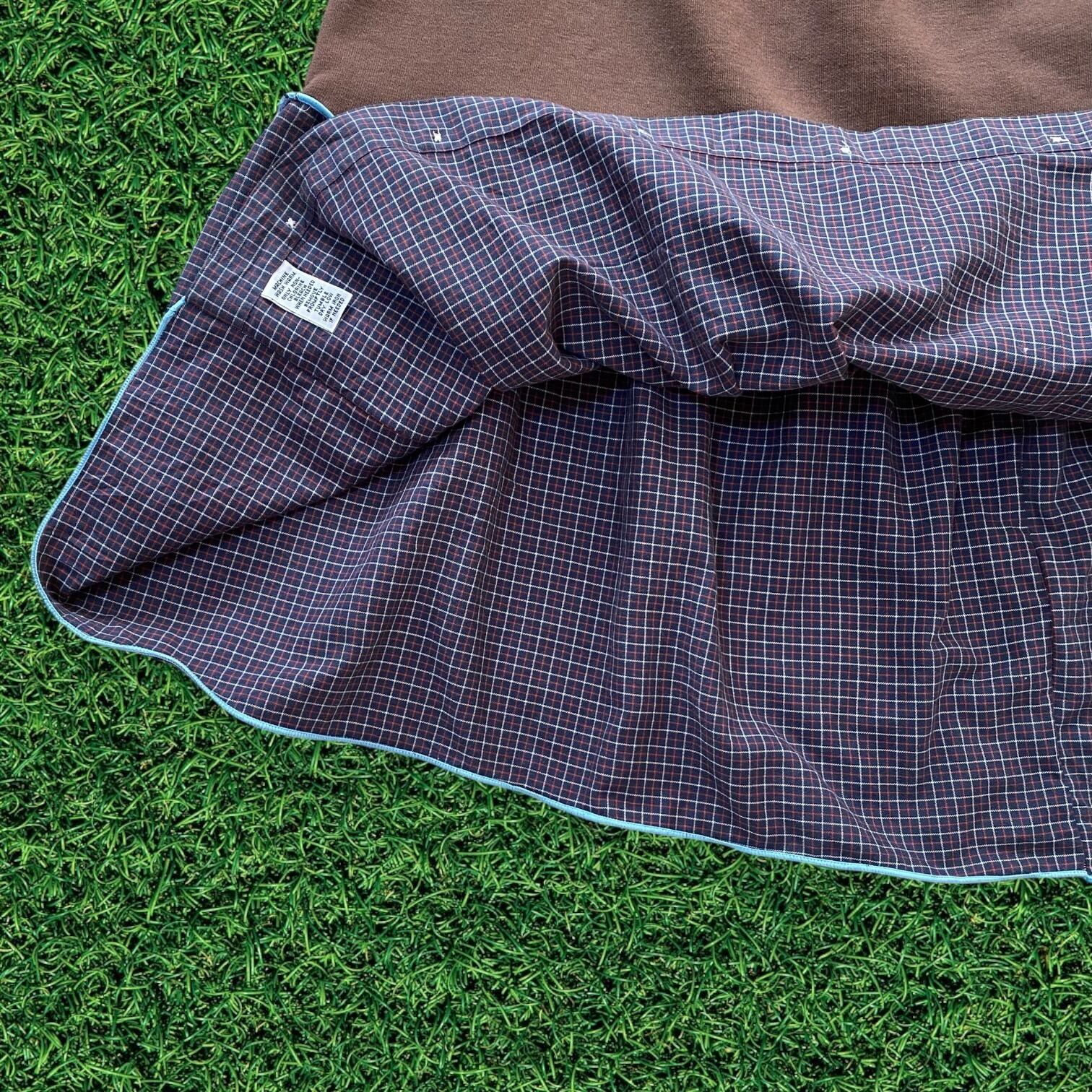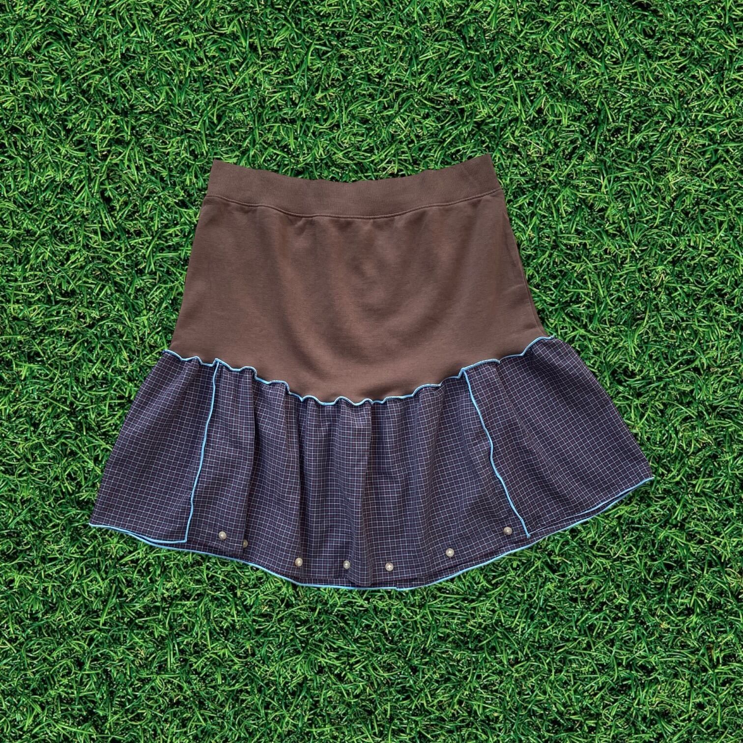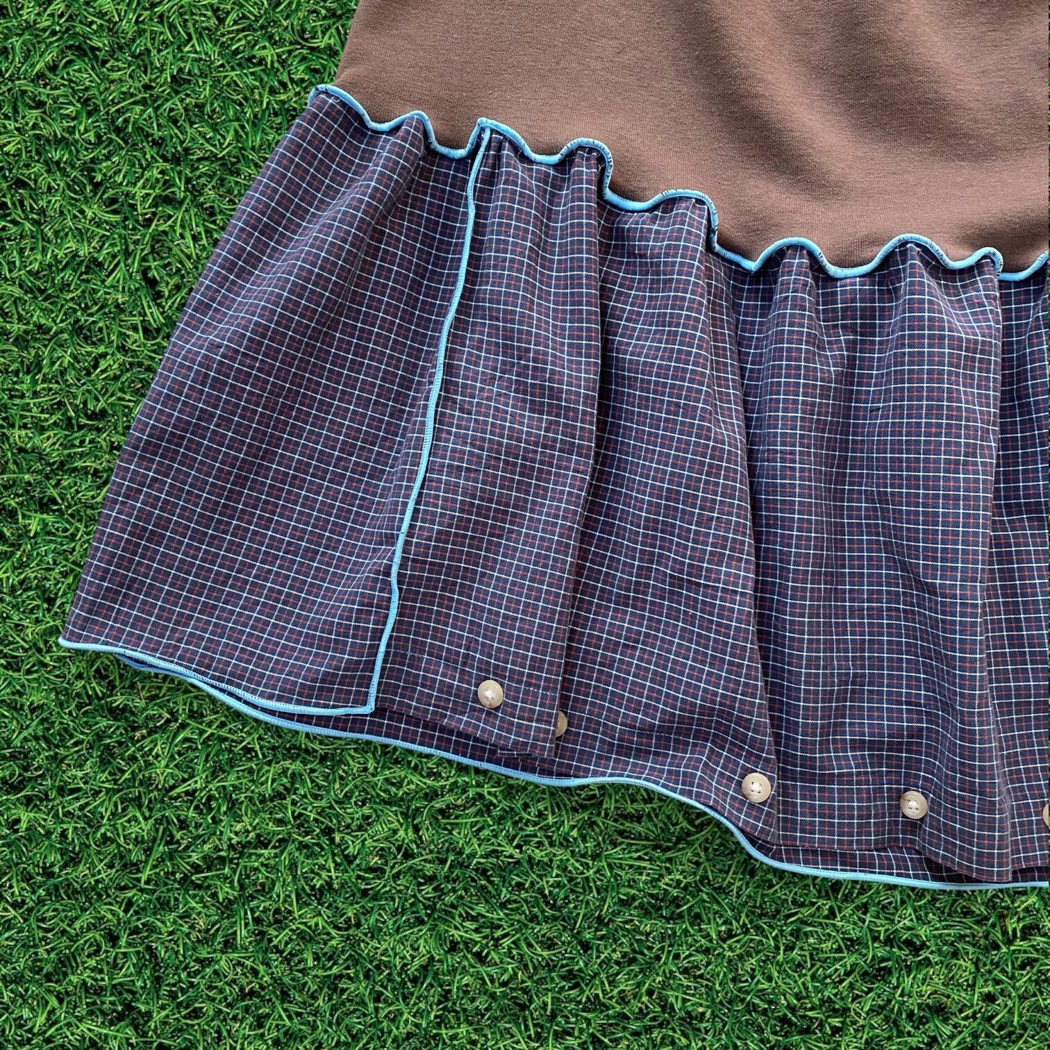 【リメイク古着】再構築メローフリルスカート レディース チェック柄×ブラウンスエットトレーナー