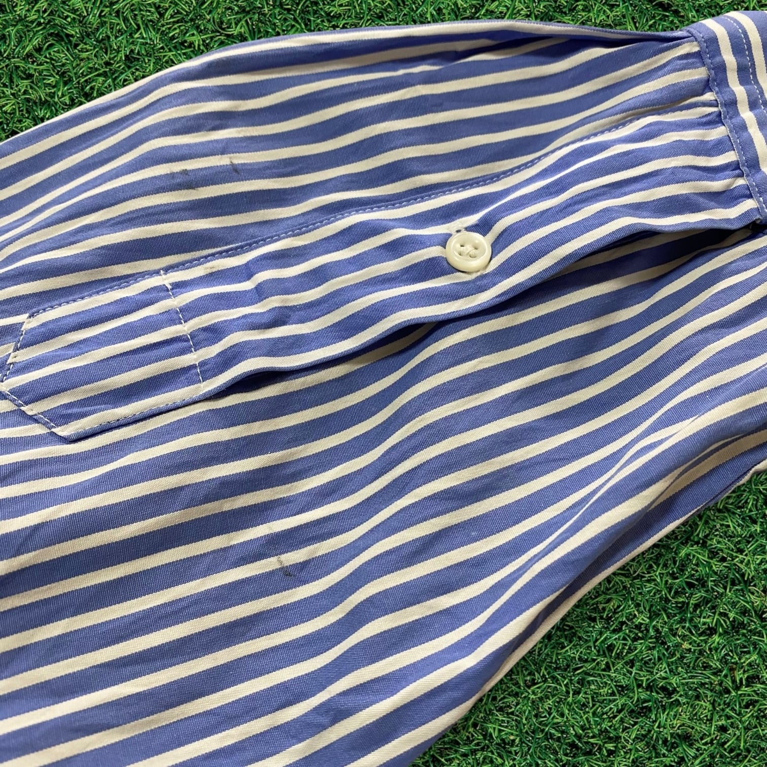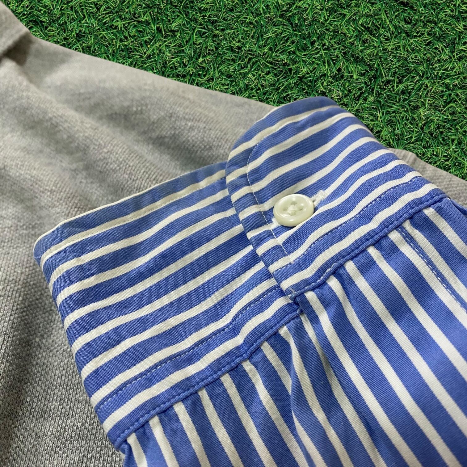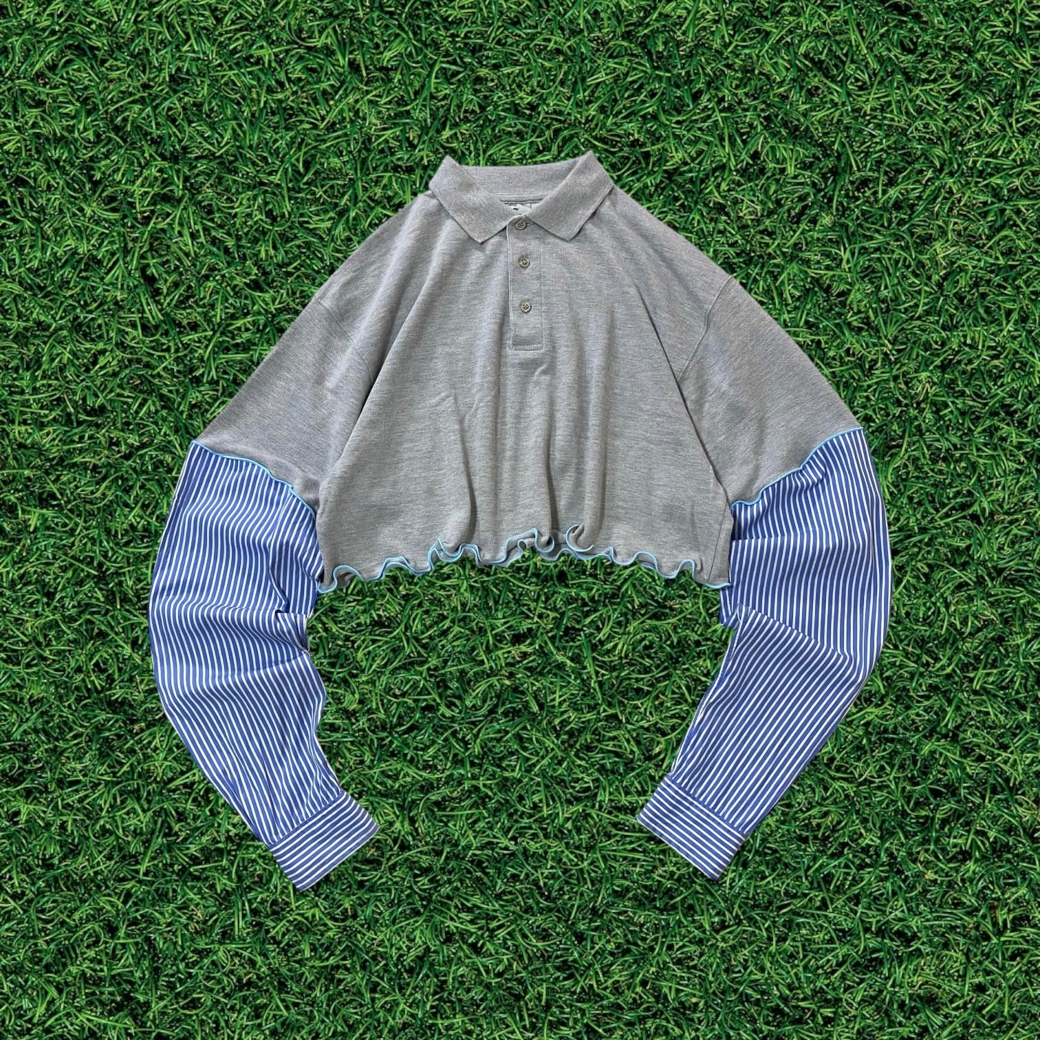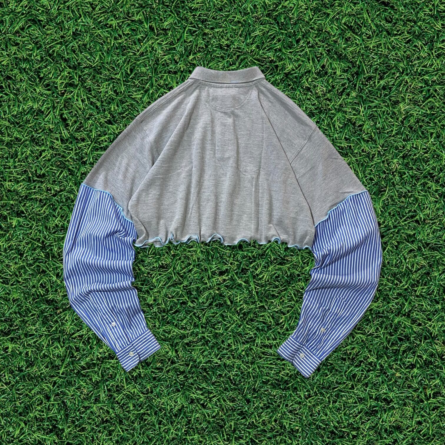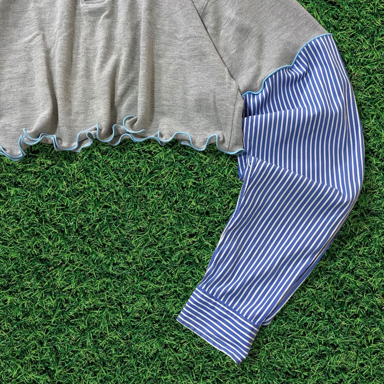 【リメイク古着】再構築USAポロシャツ×ストライプシャツ袖水色メローフリルレディース