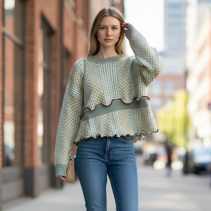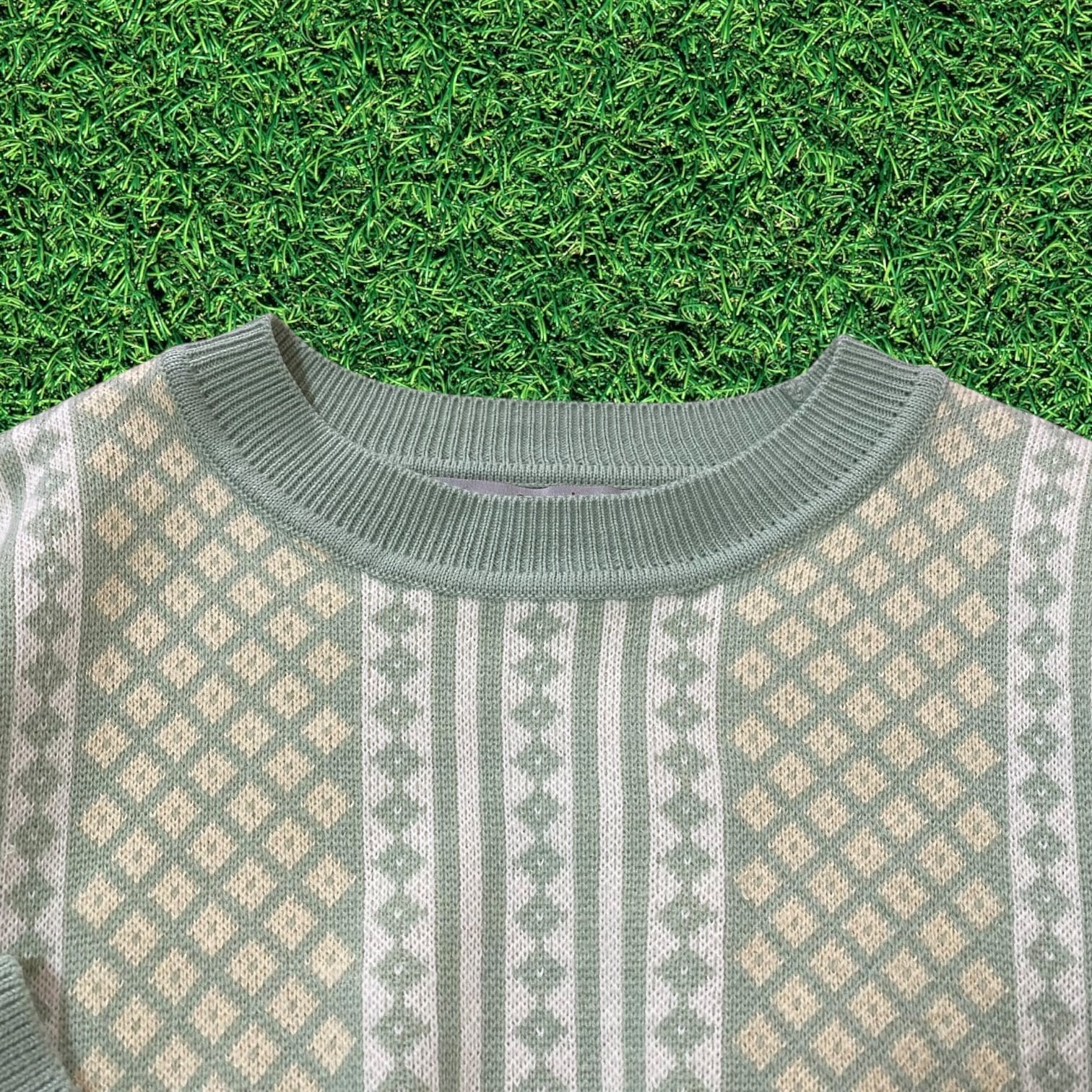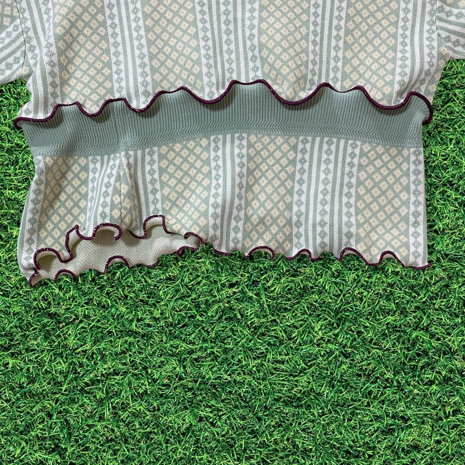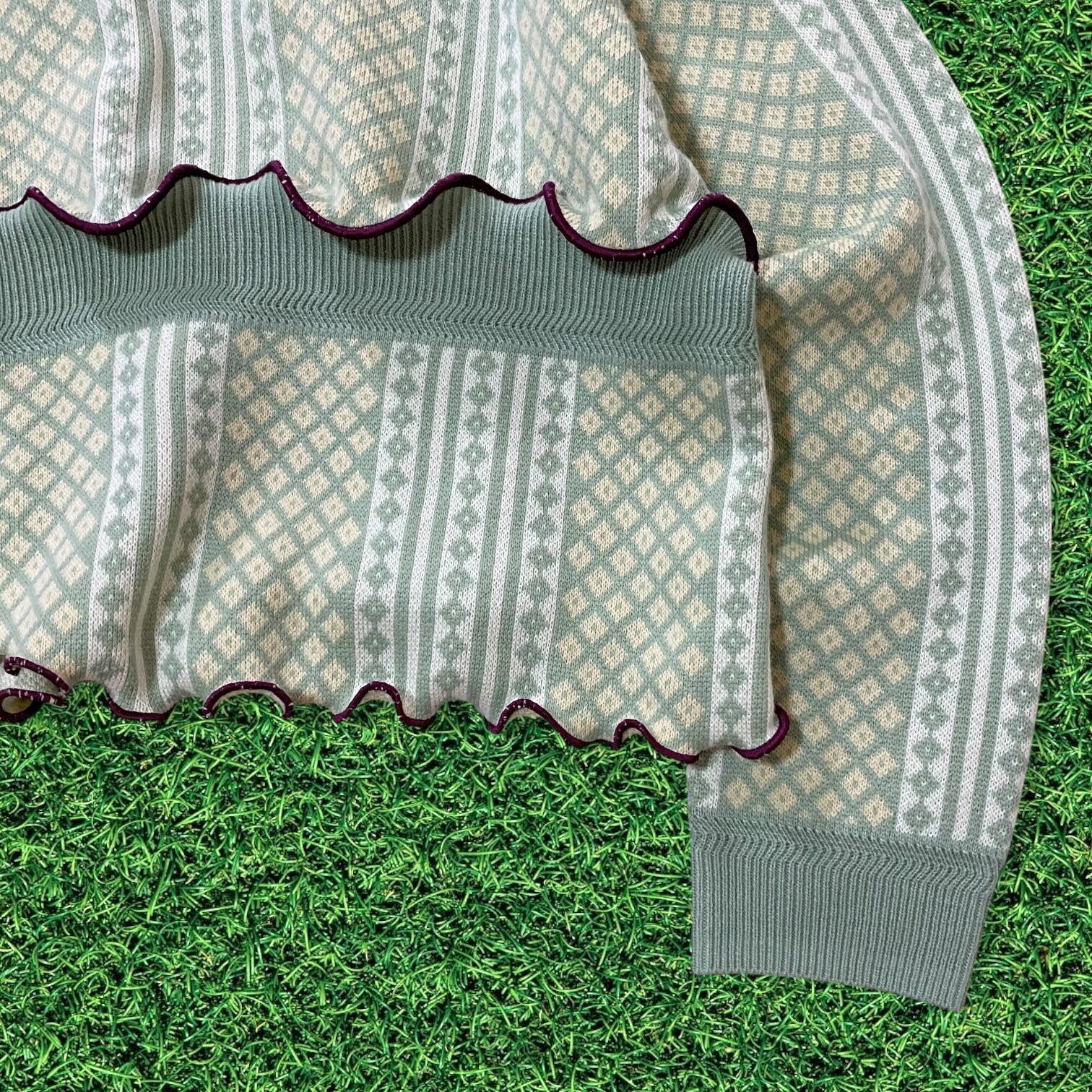 優しいグリーンにバーガンディー色のメローが目を惹くアシンメトリーの再構築ニット。