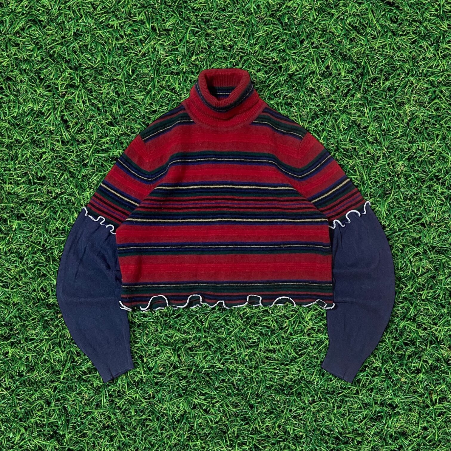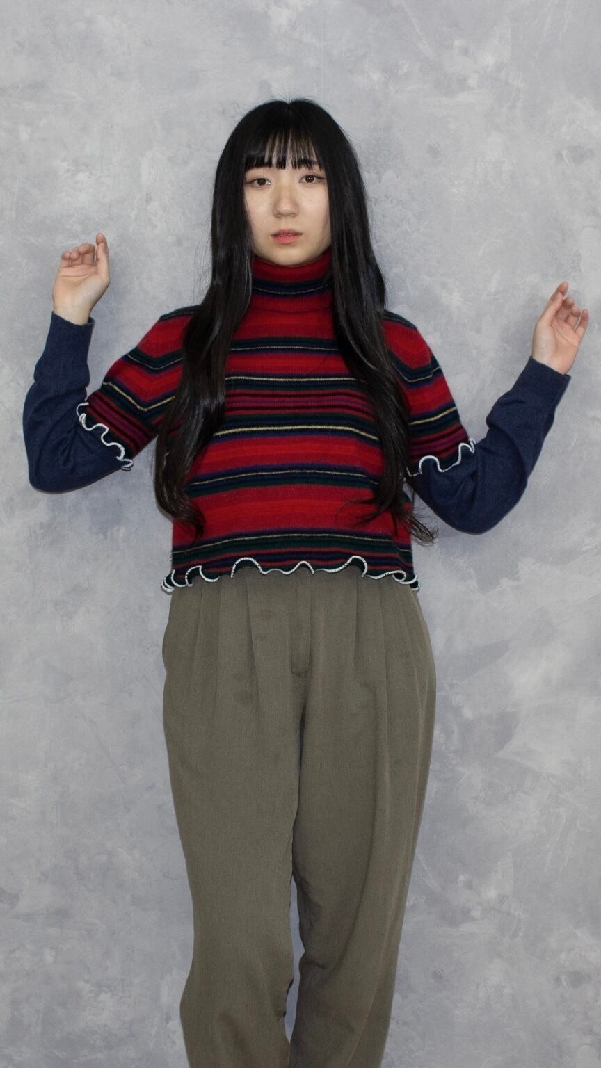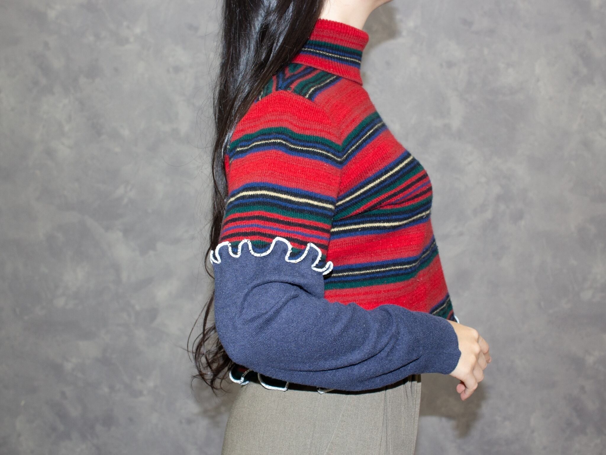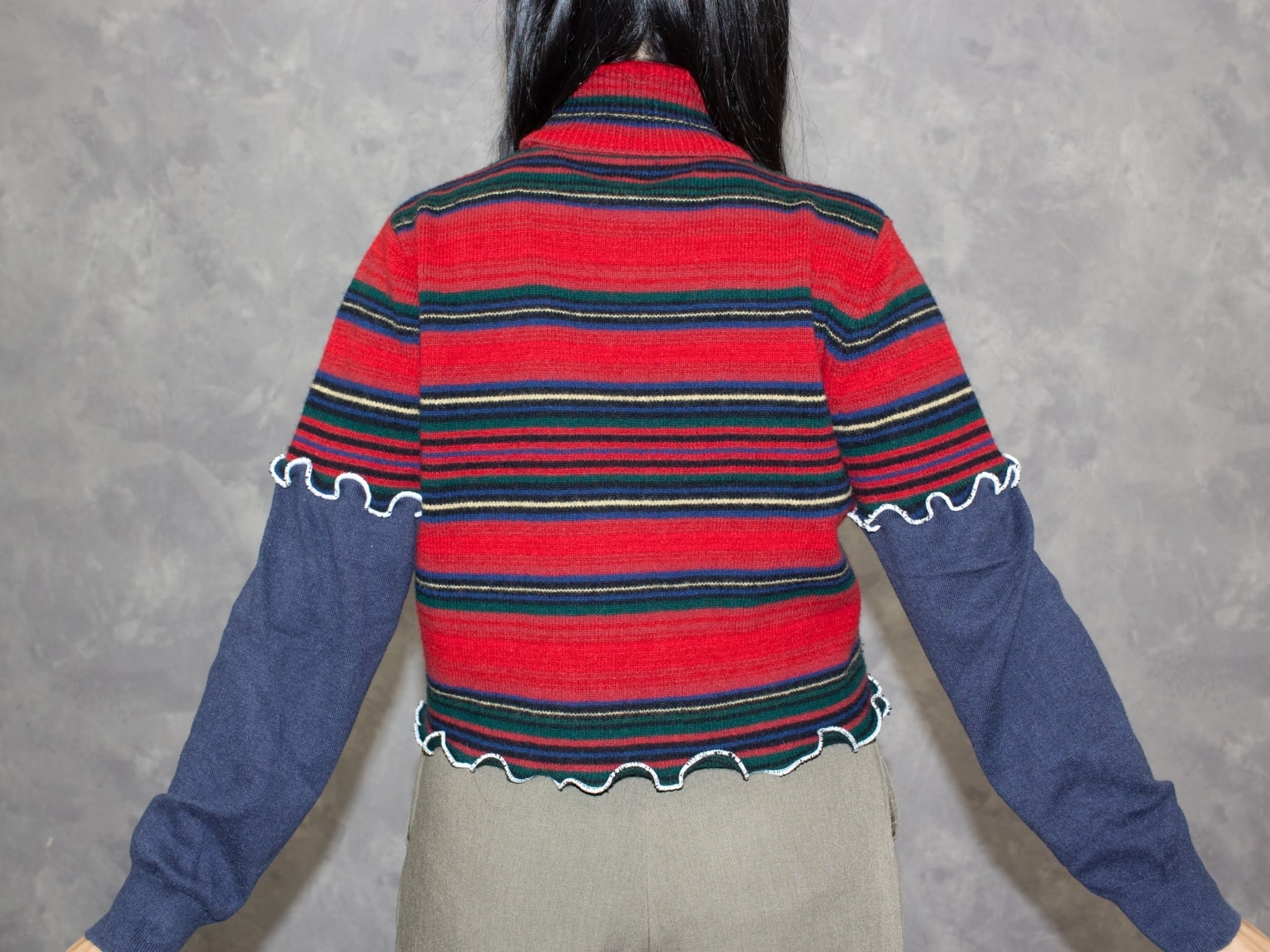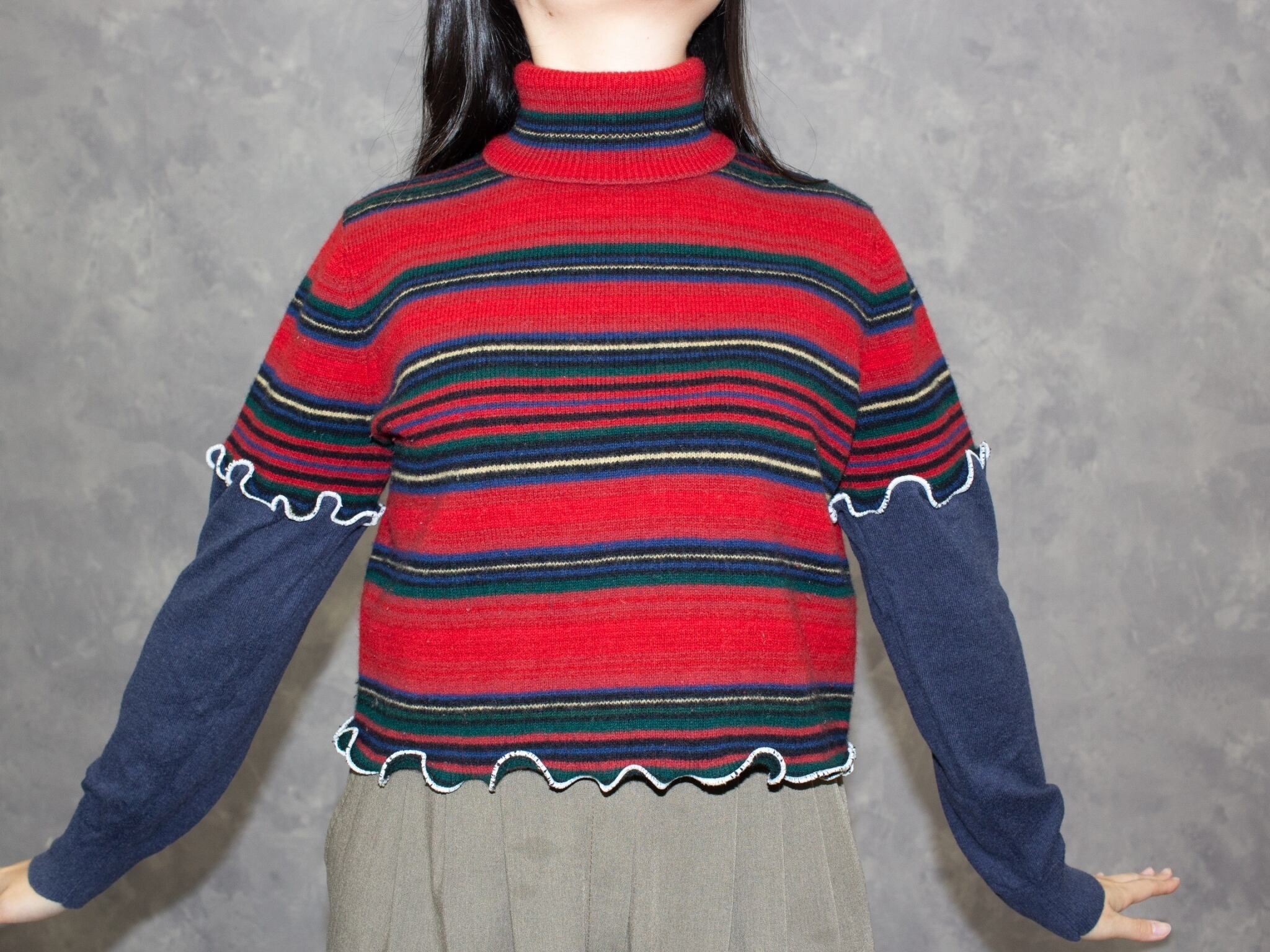 【リメイク古着】再構築タートルネックチビ丈レッドボーダーニット×ネイビーニット レディース