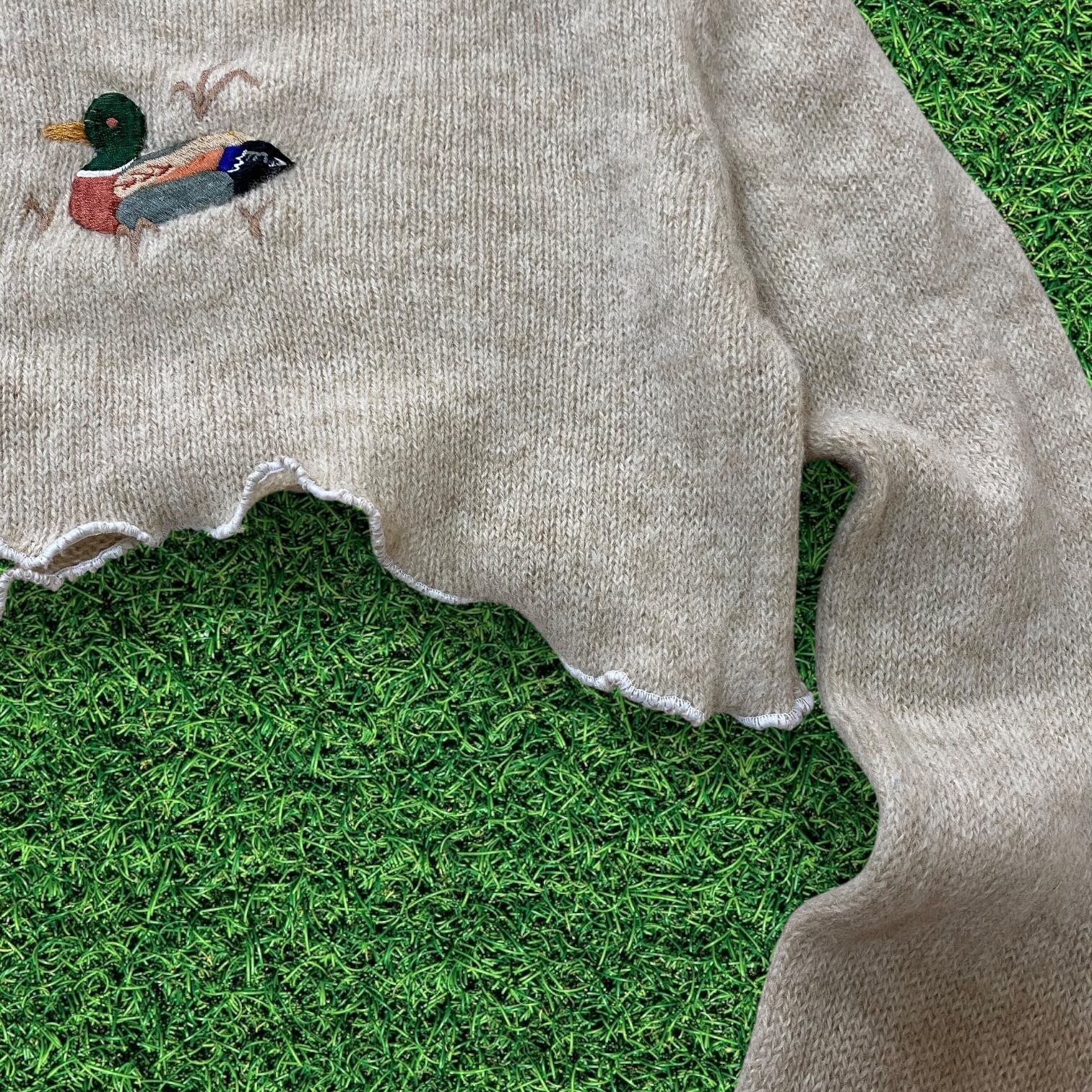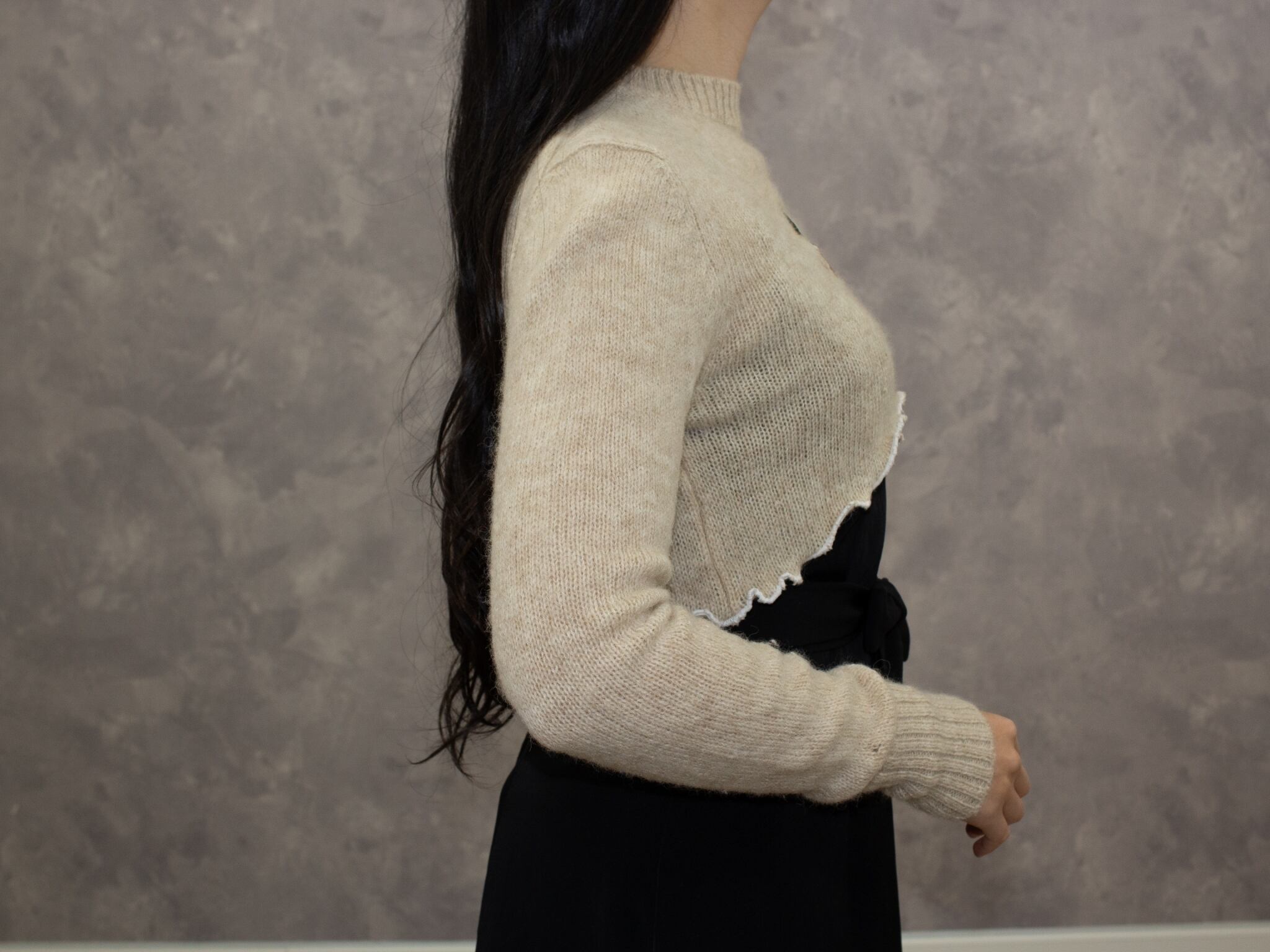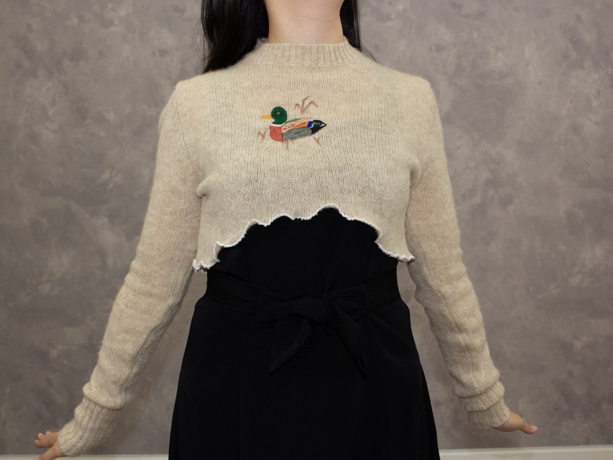 【リメイク古着】再構築チビ丈メローフリルカモ刺繍ニット