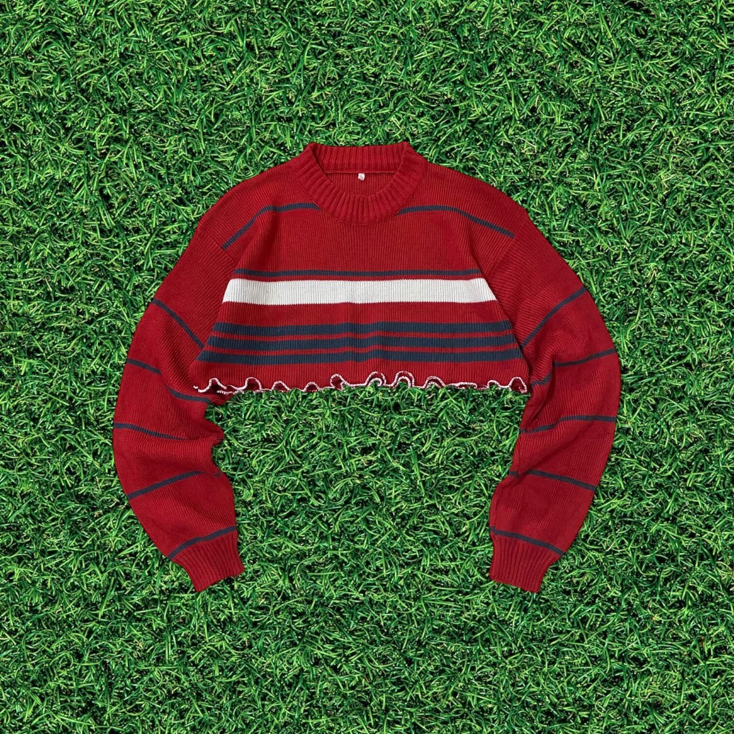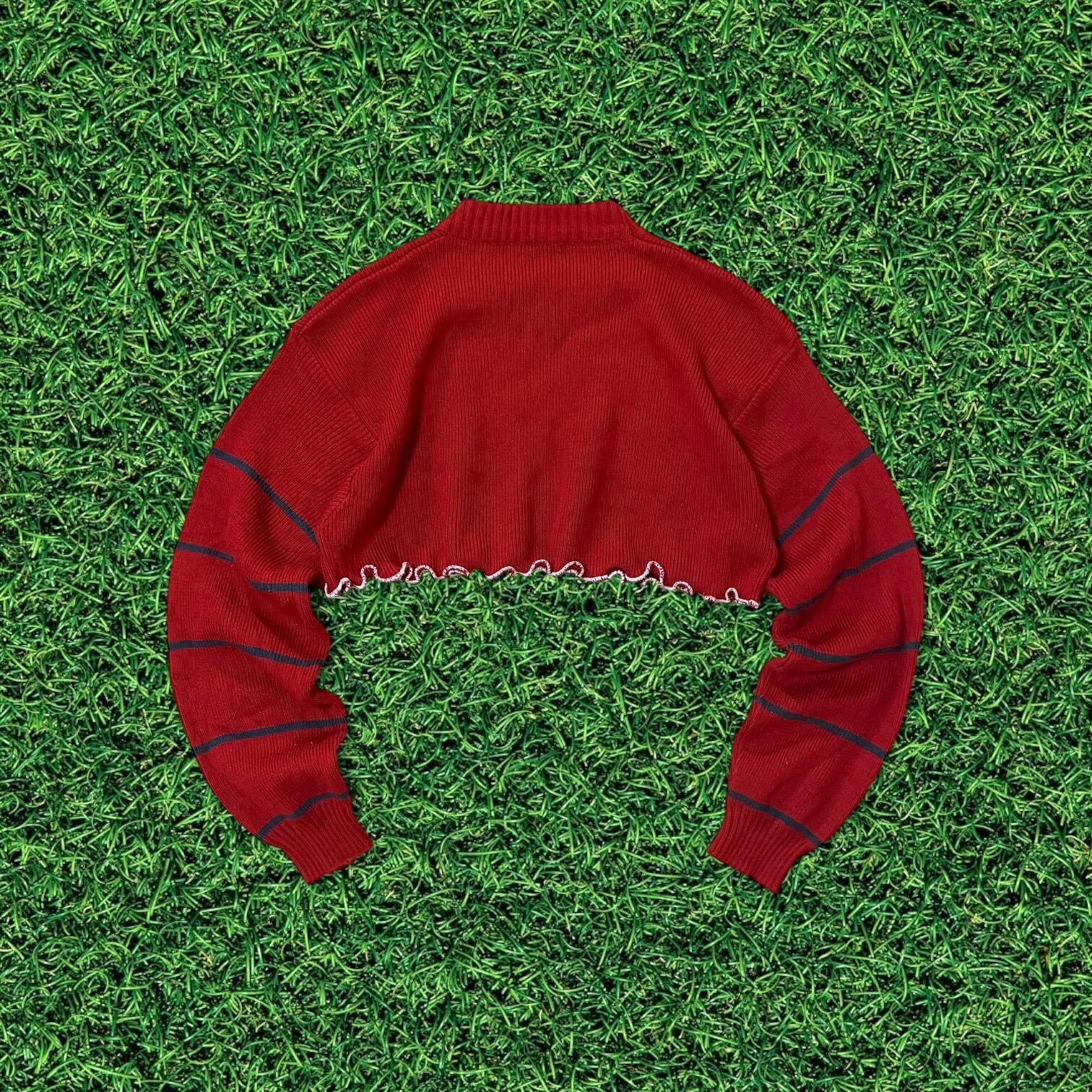 【リメイク古着】再構築短丈ニットセーター ボーダー レッド メローフリル レディース