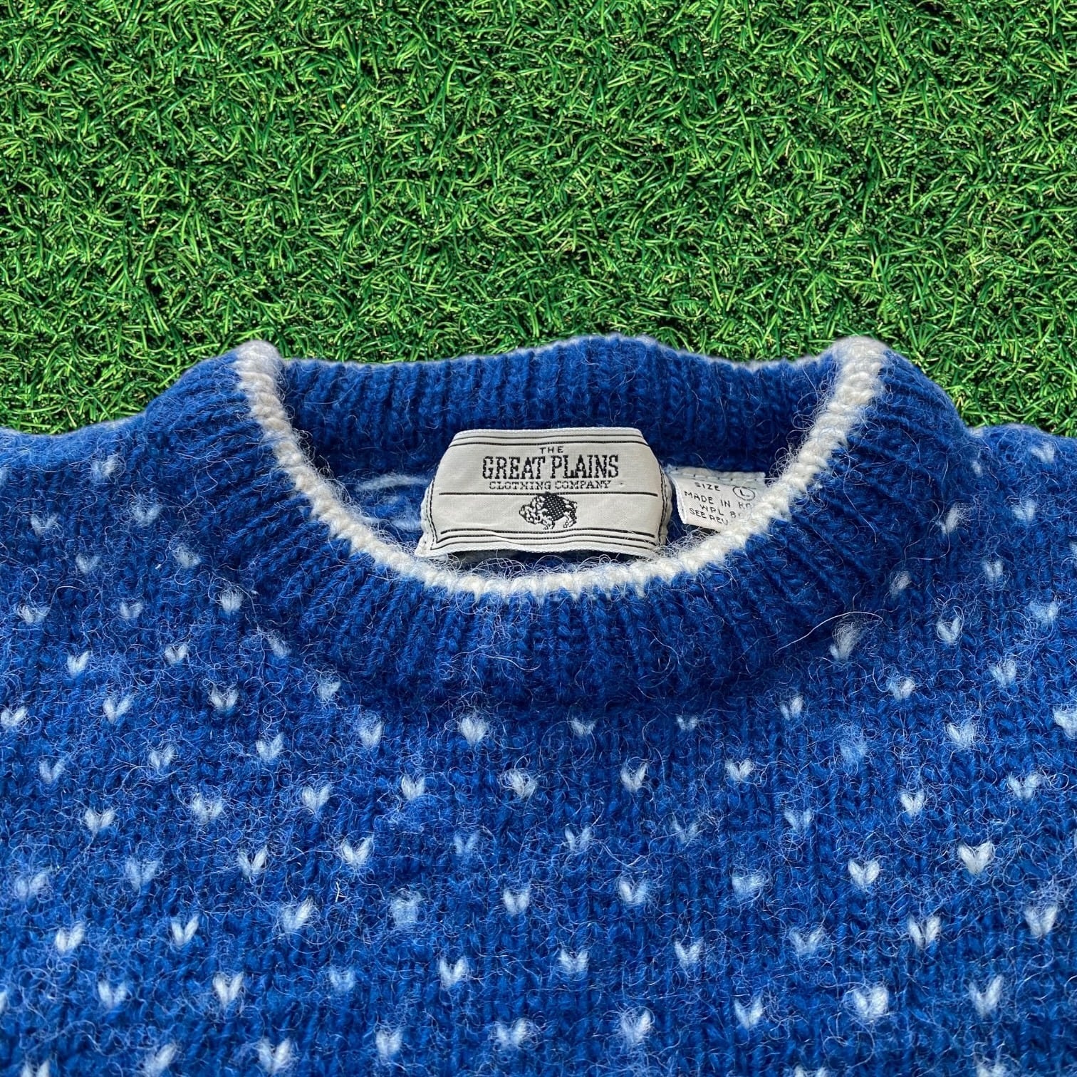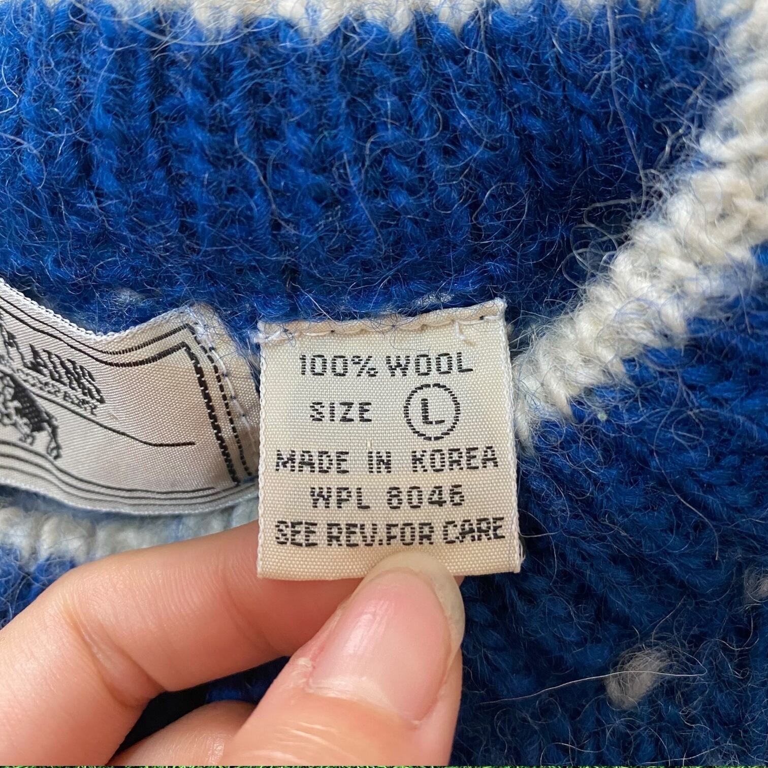 今の季節らしいノルディック風の模様とブルーとレッドとホワイトのトリコロールカラーが目を引く1着です。